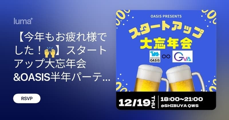 ぜひご参加ください! ⇒ 12月19日開催『スタートアップ大忘年会&OASIS半年パーティー』