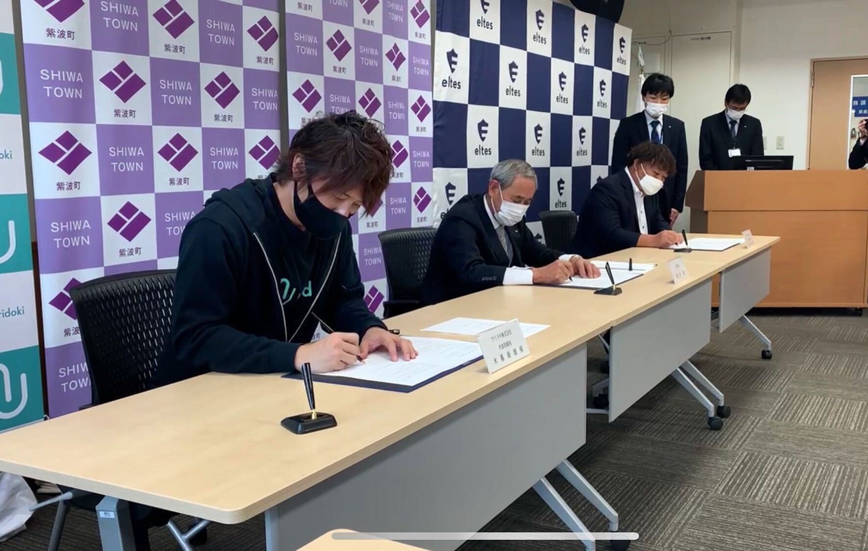 (写真左から)ウリドキ代表取締役 木暮康雄、紫波町町長 熊谷泉、エルテス代表取締役 菅原貴弘