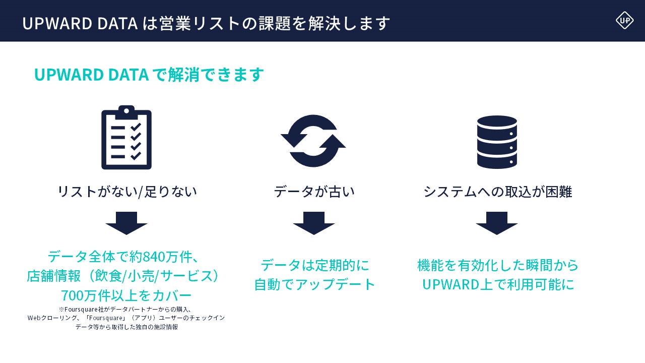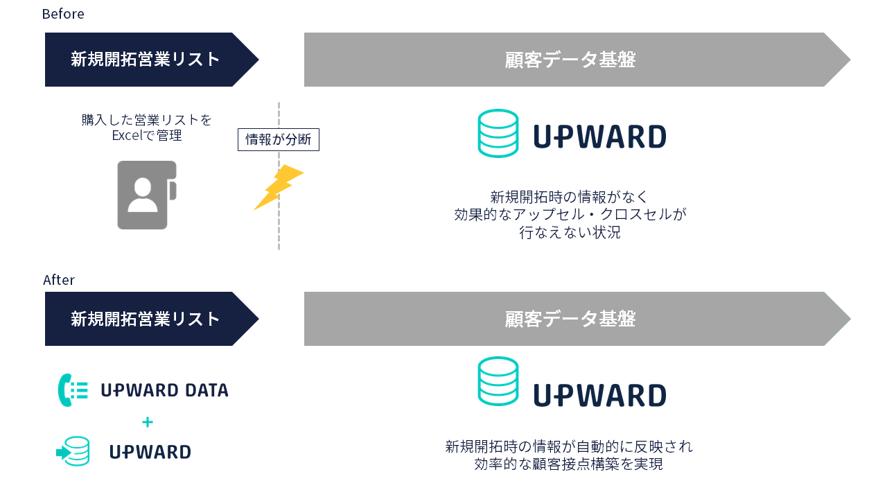 そこで、従来の新規開拓リストよりも安価かつ自動で「UPWARD」上のデータに反映される「UPWARD DATA」を導入。 今後の営業の効率化ならびに顧客基盤構築の促進を狙います。
