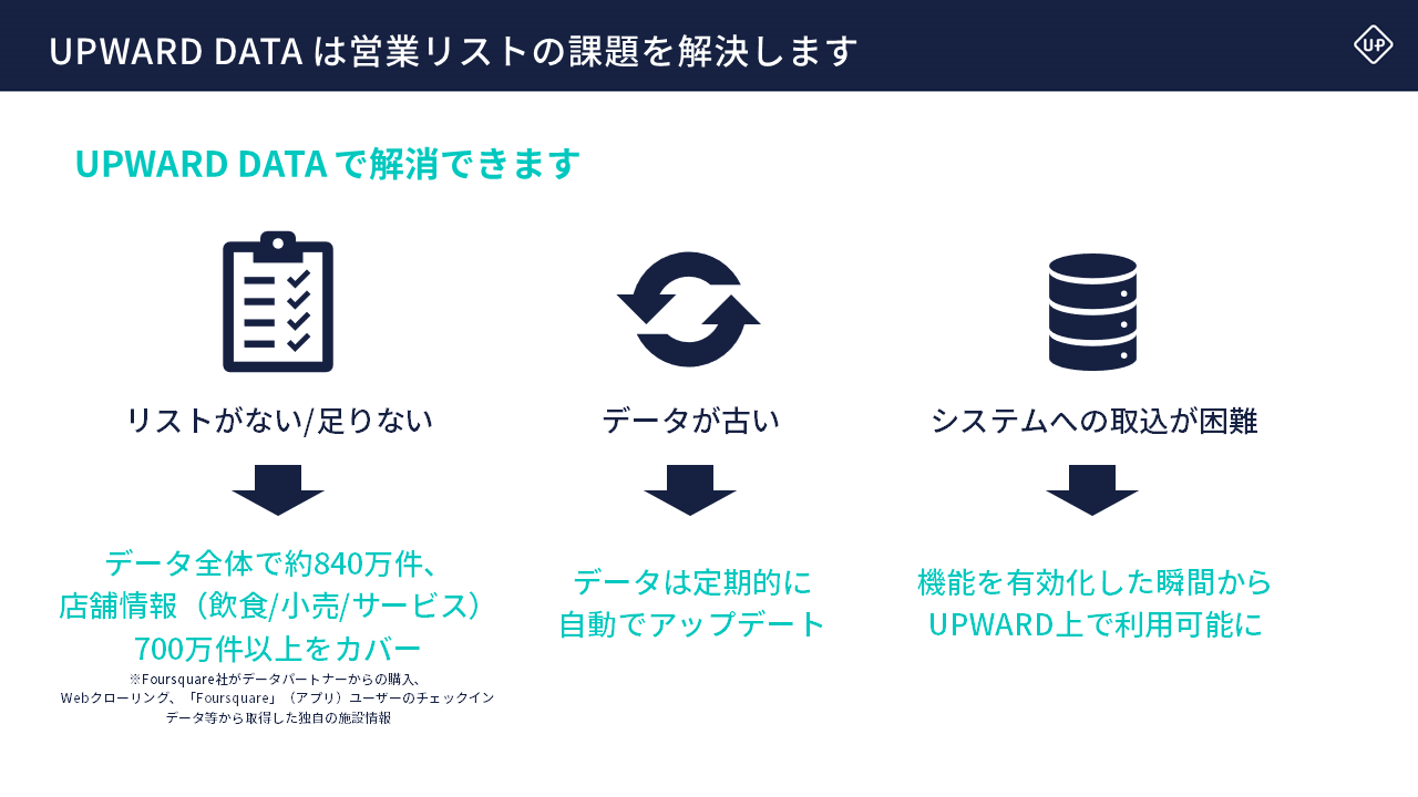「UPWARD DATA」は、CRMとシームレスに連携し、顧客情報を優先度別に可視化するデジタル地図「UPWARD」上にFoursquare社提供の「Foursquare Places」内の施設データを連携し、新規開拓における営業リストを現場にリアルタイムに提供する機能です。
