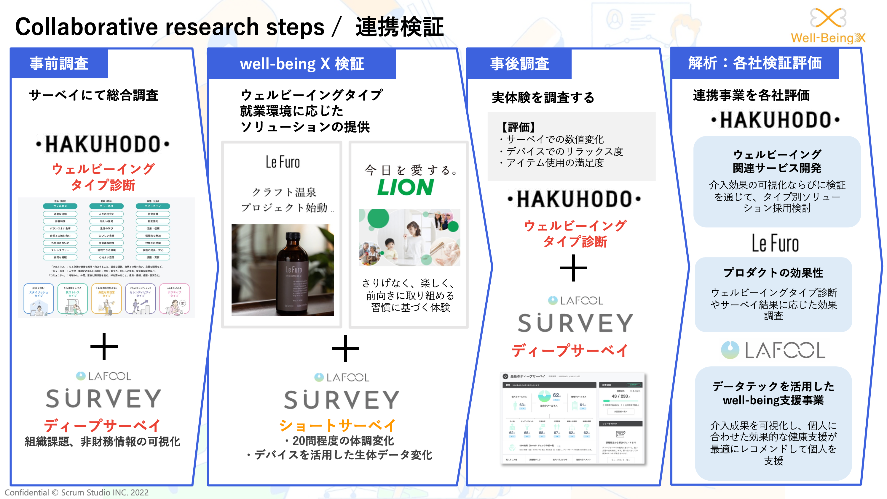 さらに、オープンイノベーションの持ち味である3社以上の複数企業での事業共創として、在宅勤務時のウェルビーイング改善を目的としたサービス開発構想を株式会社博報堂、株式会社ラフール、株式会社Le Furo、ライオン株式会社が共同で発表いたしました。コロナ禍において一変した「在宅勤務の環境」におけるウェルビーイング向上をリードしていきます。