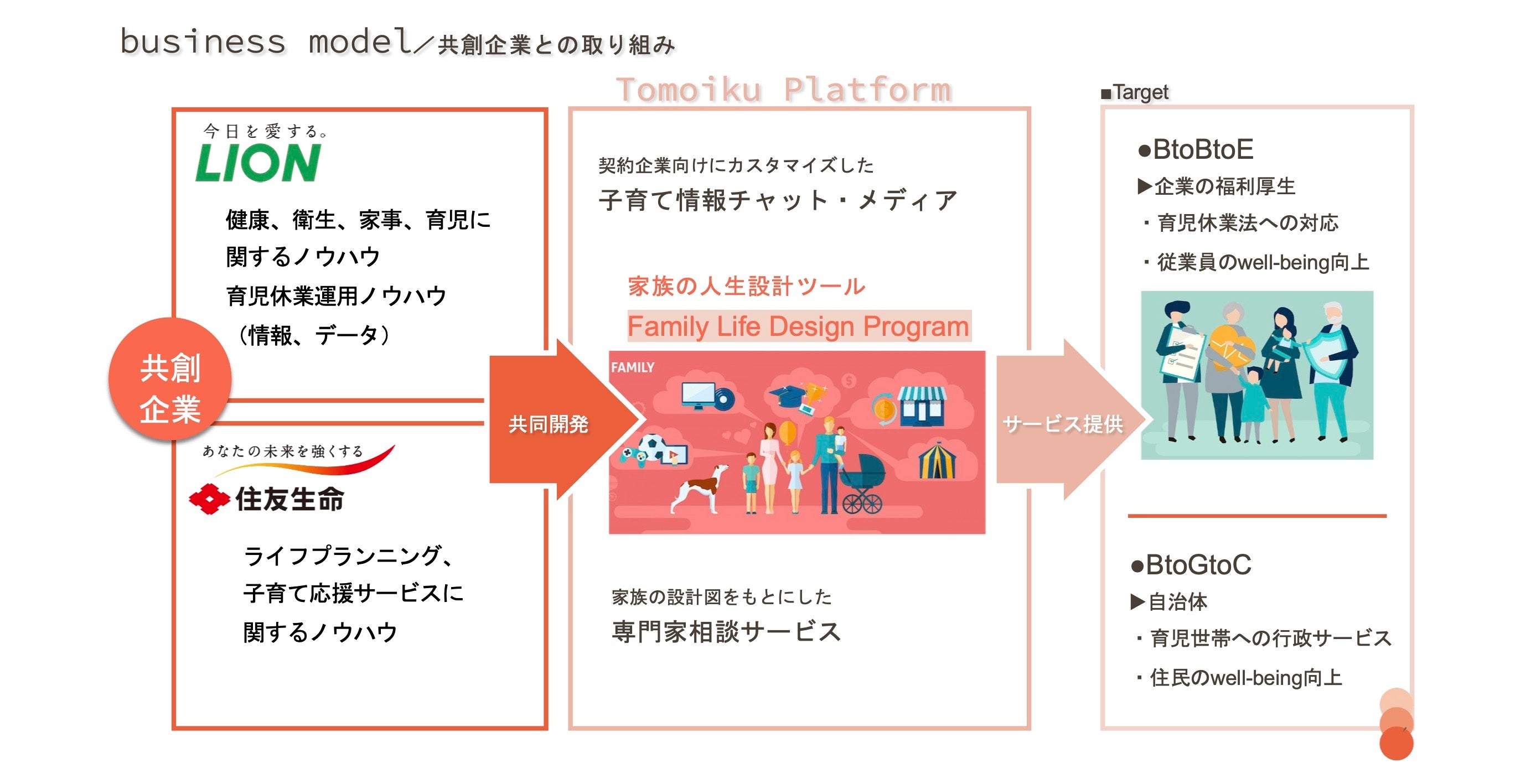 ● 概要:子育て家族のウェルビーイングに繋がる大切な時期として、産前産後休業や育児休業に着目しました。自分自身と家族のありたい姿を描く機会と、家族の暮らしやお金、健康、育児に関わる確かな情報を提供すること、また、産前産後を通して信頼できる専門家が伴走することにより、安心して新たな家族を迎え、復職後やその後に長く続く、家族の暮らしの土台を築くためのサービスを構想しています。 上記のような産休・育休期間におけるソリューションの提供が、復職後の家族の生活習慣や幸福度、働きがいなどにどのように影響するかについて、2023年春からの実証実験にて検証した後、早期の事業化スタートを目指します。