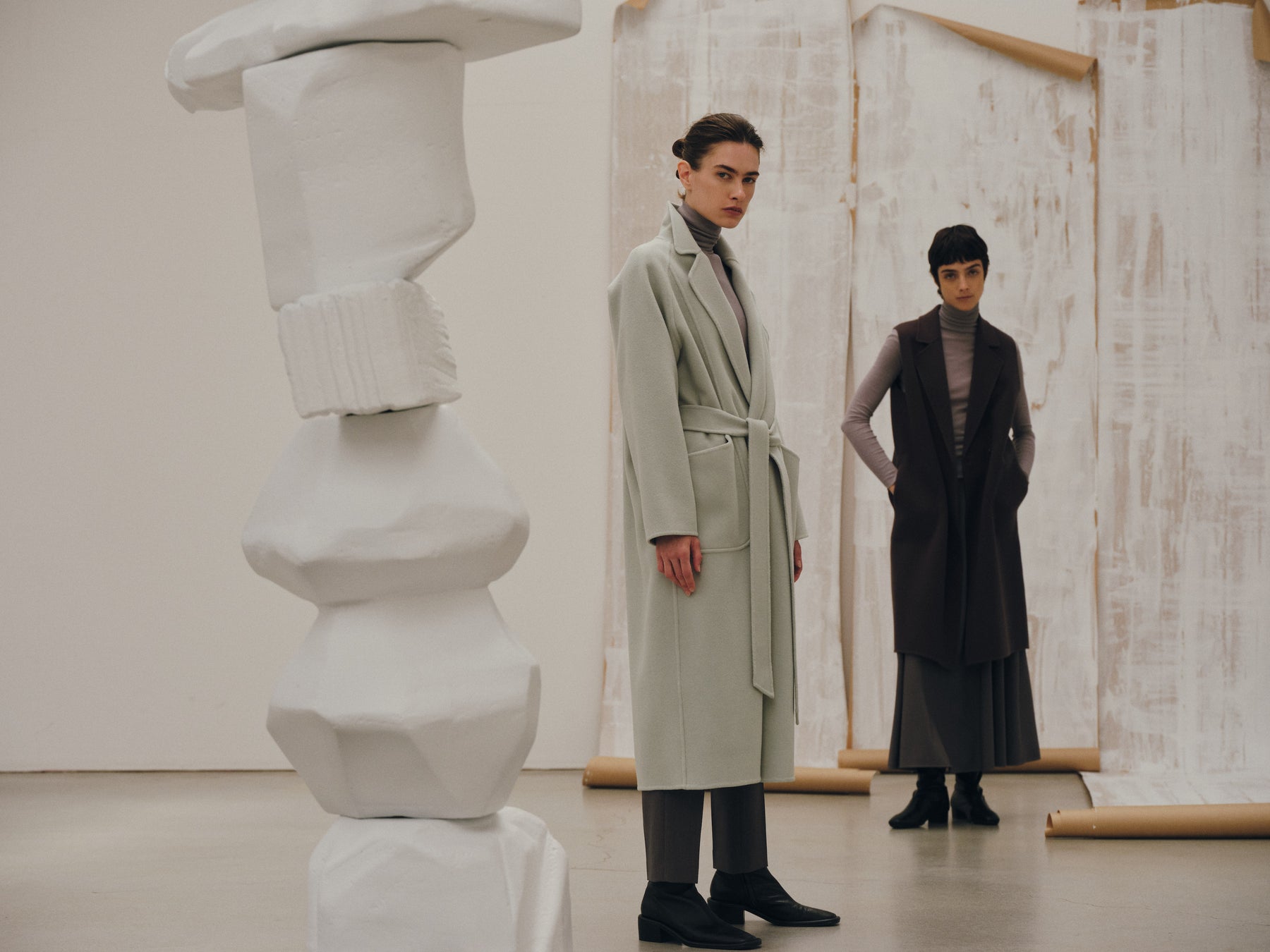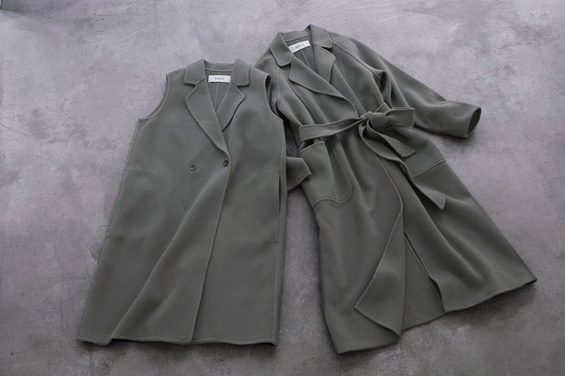 今回ミモレとの初コラボのアイテムは、「ウールリバーローブコート」「ウールリバーロングジレ」の2型。ニュアンスのある「KHAKI GRAY(カーキグレー)」をミモレ別注カラーとして展開します。