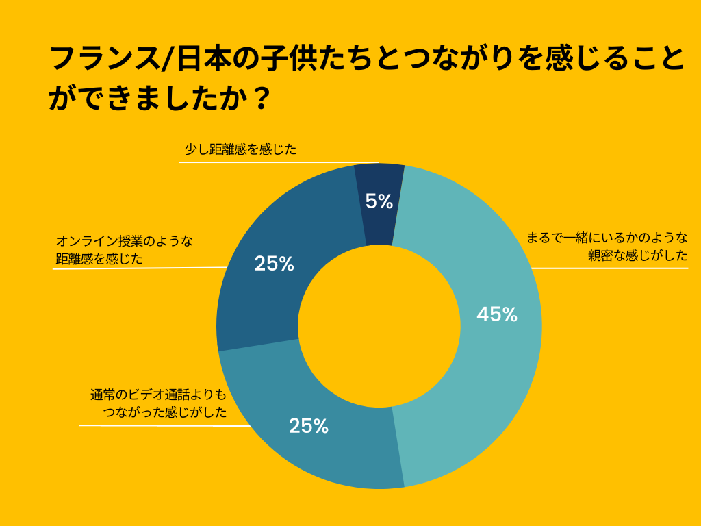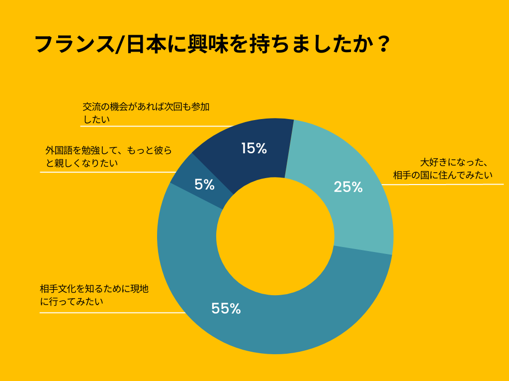 「フランス/日本に興味を持ちましたか?」という質問に対し、5人(25%)が「フランス/日本が大好きになった、フランス/日本に住みたい」、11人(55%)が「フランス/日本文化を知るために現地に行ってみたい」と回答。