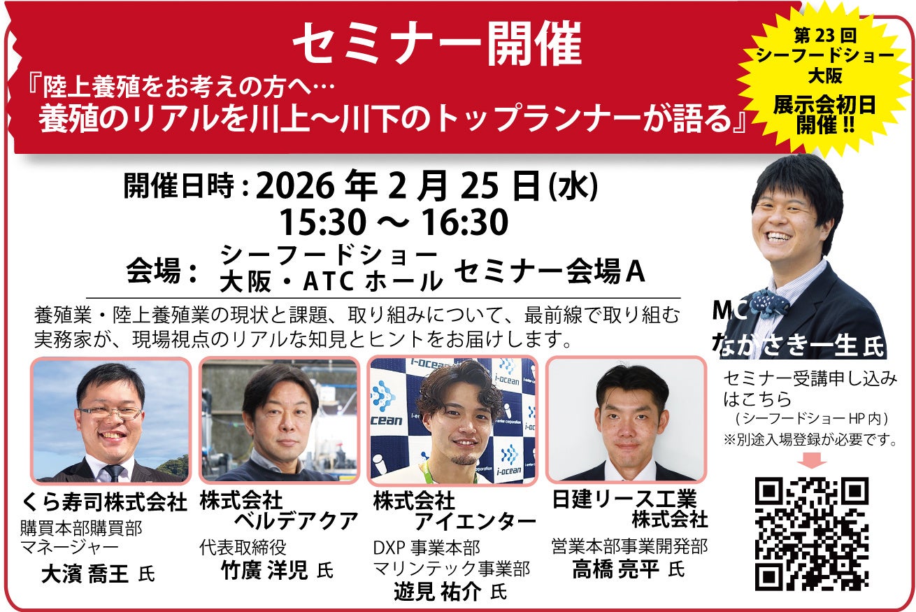「そこでしか食べられないさかなの価値を届ける」をコンセプトに、活魚流通、陸上養殖事業と、バリューチェーンを繋ぐことで価値創造を推進する日建リース工業株式会社(本社:東京都千代田区、代表取締役社長執行役員 金子弘)は、2026年2月25日(水)15:30から、セミナー「陸上養殖をお考えの方へ…養殖のリアルを川上~川下のトップランナーが語る」を、シーフードショー大阪・セミナー会場(大阪・ATCホール)で開催いたします。
