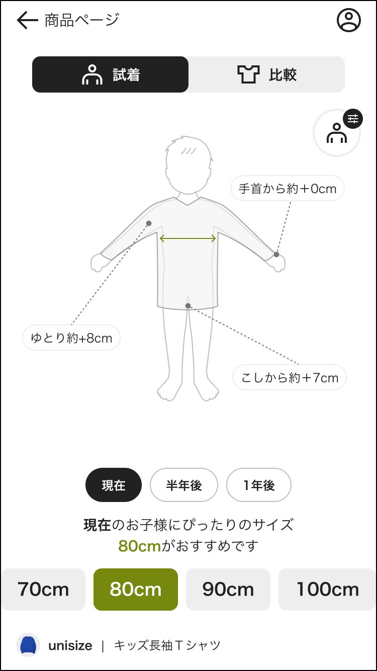 1年で10cm以上身長が伸びるベビー年代では、半年後・1年後を見据えたサイズ選びが重要となっています。unisizeKIDSではこのようなニーズに答えるために、半年後・1年後の成長したシルエットや、おすすめサイズを確認することができます。