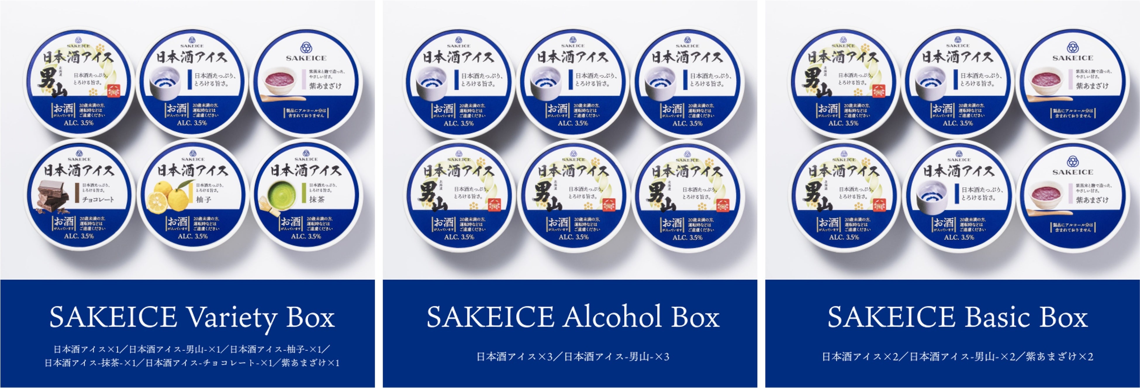 ・SAKEICE Variety Box(日本酒アイス×1、日本酒アイス-男山-×1、日本酒アイス-柚子-×1、日本酒アイス-抹茶-×1、日本酒アイス-チョコレート-×1、紫あまざけ×1)