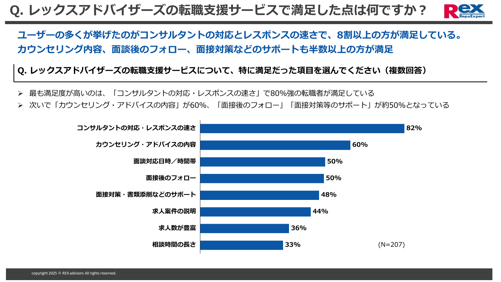 続いて、レックスアドバイザーズのサービスについて、どういった点に満足されたかを聞きました。