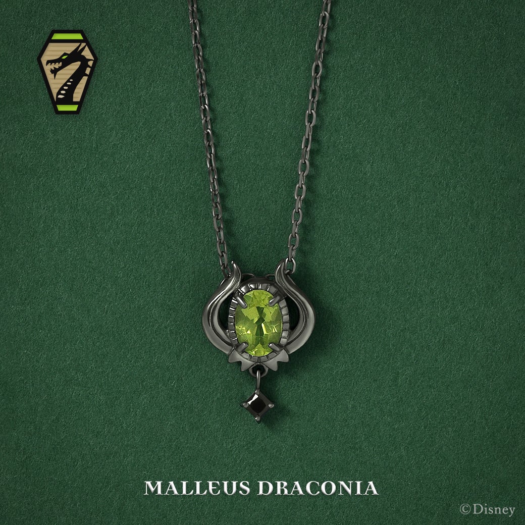 「マレウス・ドラコニア」のアイコンに描かれているドラゴンをイメージし、ドラゴンの角や襟部分を、透かしのある立体的なフォルムで表現しました。メインストーンにペリドット、下に下がった部分はオニキスカラーのキュービックジルコニアを使用し、全体で「マレウス」をイメージしたカラーリングにまとめています。裏側の光窓はドラゴンの瞳の光彩をイメージしました。