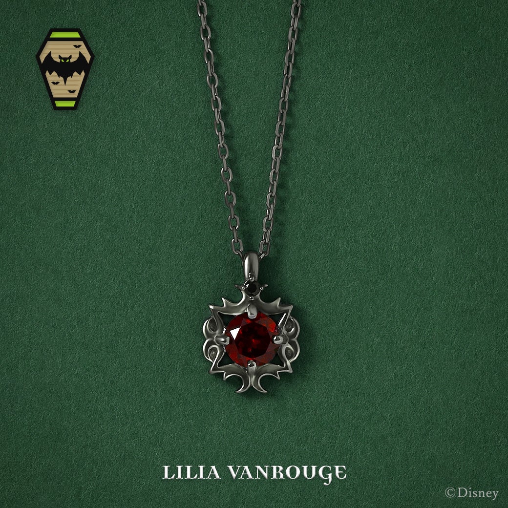 「リリア・ヴァンルージュ」のアイコンに描かれているコウモリや、寮服の帽子、茨などをイメージし、透かしのある立体的なフォルムで繊細に表現しました。裏面にはコウモリのマークをさりげなく取り入れています。メインストーンはガーネットを使用し、全体は「リリア」をイメージしたカラーリングでまとめました。