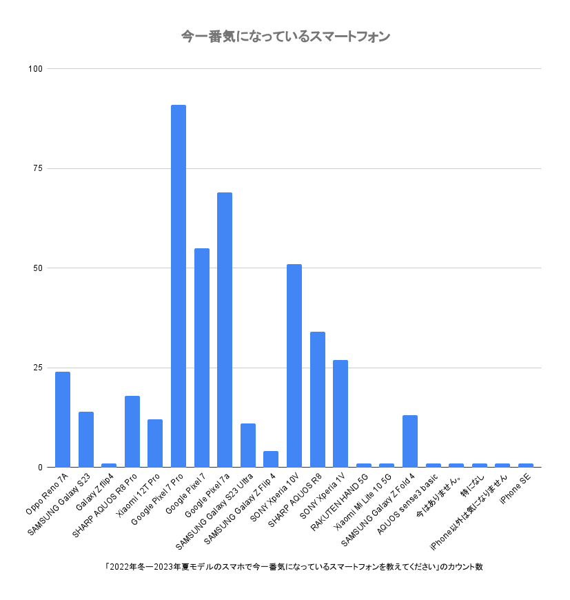 今回はiPhoneを除いたAndroidスマーフォンに対象を絞ってアンケートを取りました。それでも「iPhoneしか気にならない」とわざわざ記入するほどの熱狂的なファンもいました。