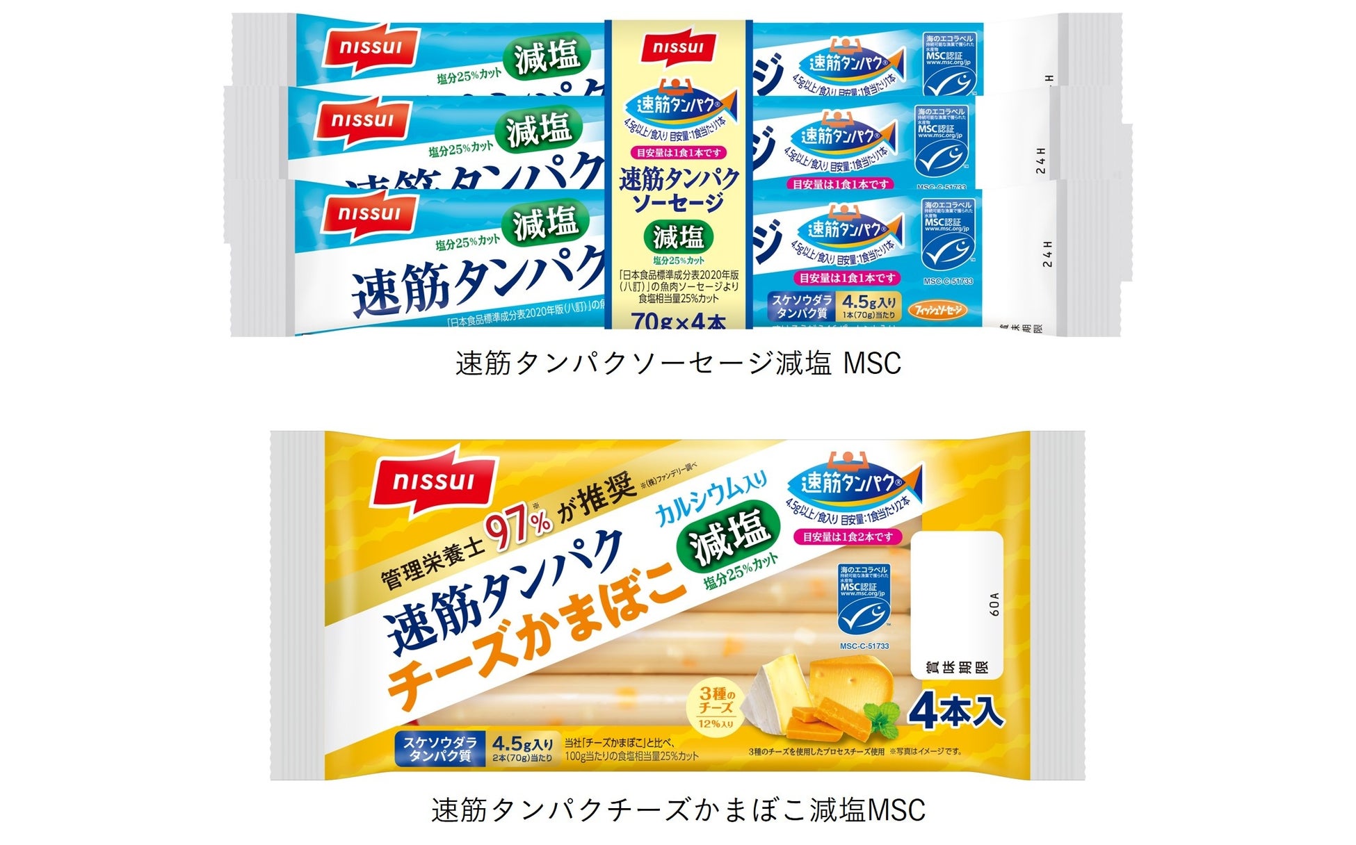 1食分でスケソウダラの「速筋タンパク」が4.5g以上摂れるちくわやフィッシュソーセージなどに「速筋タンパク」マークを付けてシリーズ展開しています。全17品。