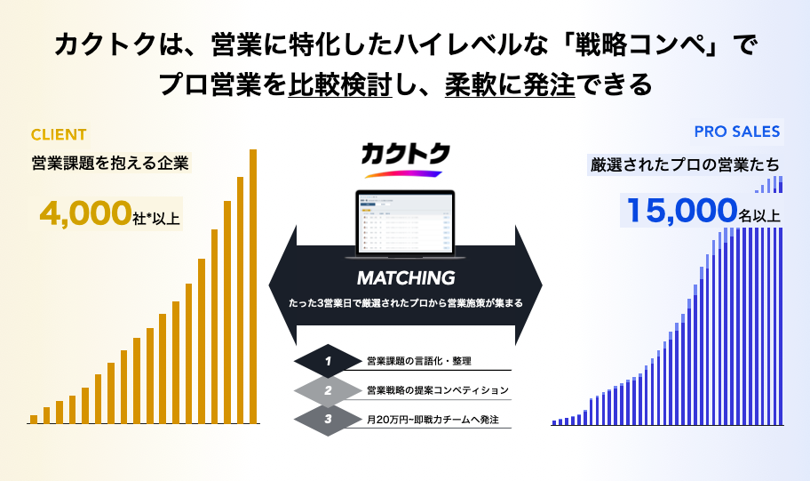 今回のビジネスマッチング提携では、営業活動に課題を抱える企業とプロ営業をつなぐ日本最大級の営業代行プラットフォーム「カクトク」を、本サービスにニーズのある顧客に提供します。