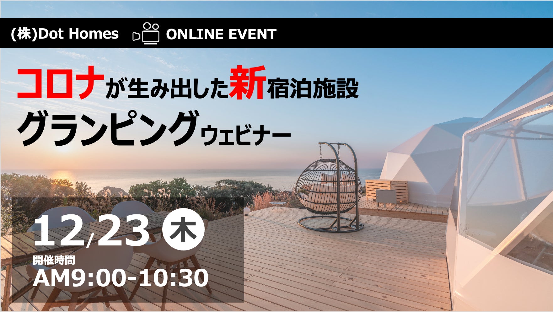 株式会社Dot Homes(代表取締役:留田紫雲 以下、Dot Homes)は、12月23日午前9時から、グランピング事業をお考えの事業者様に向け、無料のWebセミナーを開催いたします。参加特典として、日本初の“グランピング開業・運営完全マニュアルを無料プレゼントしておりますので、是非ご参加ください。