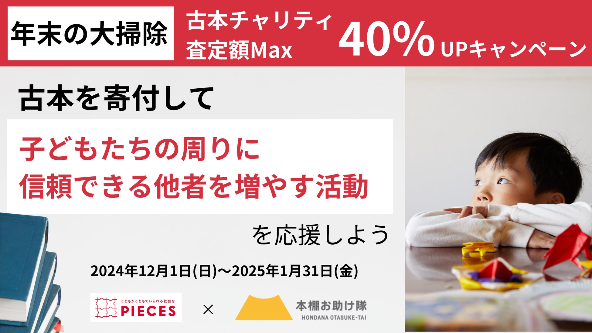 本取り組みは、読み終えた本やDVD、ゲームなどを買い取り、査定額を寄付金とする株式会社ブギのサービス「本棚お助け隊」を通じた寄付プログラムです。年末の大掃除に合わせて、査定額最大40%上乗せキャンペーンを実施します。ご寄付は子どもの孤立を防ぐ啓発活動、市民性醸成プログラムなど、PIECESの活動全般に役立てられます。