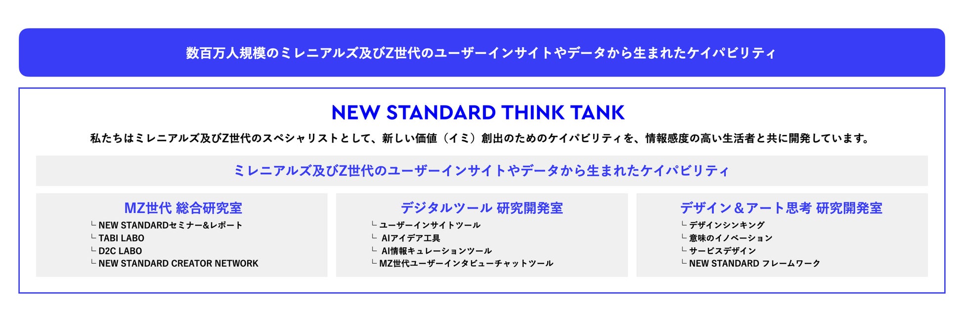 「NEW STANDARD THINK TANK」の特徴は、新しい価値(イミ)創出のためのNEW STANDARD独自のケイパビリティを、情報感度の高い数百万人規模のミレニアルズ及びZ世代と共に開発している点にあります。メディア『TABI LABO』の運営や、イベントスペース&カフェ「BPM」の運営などから得た知見とネットワークを集約し、NEW STANDARDならではの提供価値として強化していきます。
