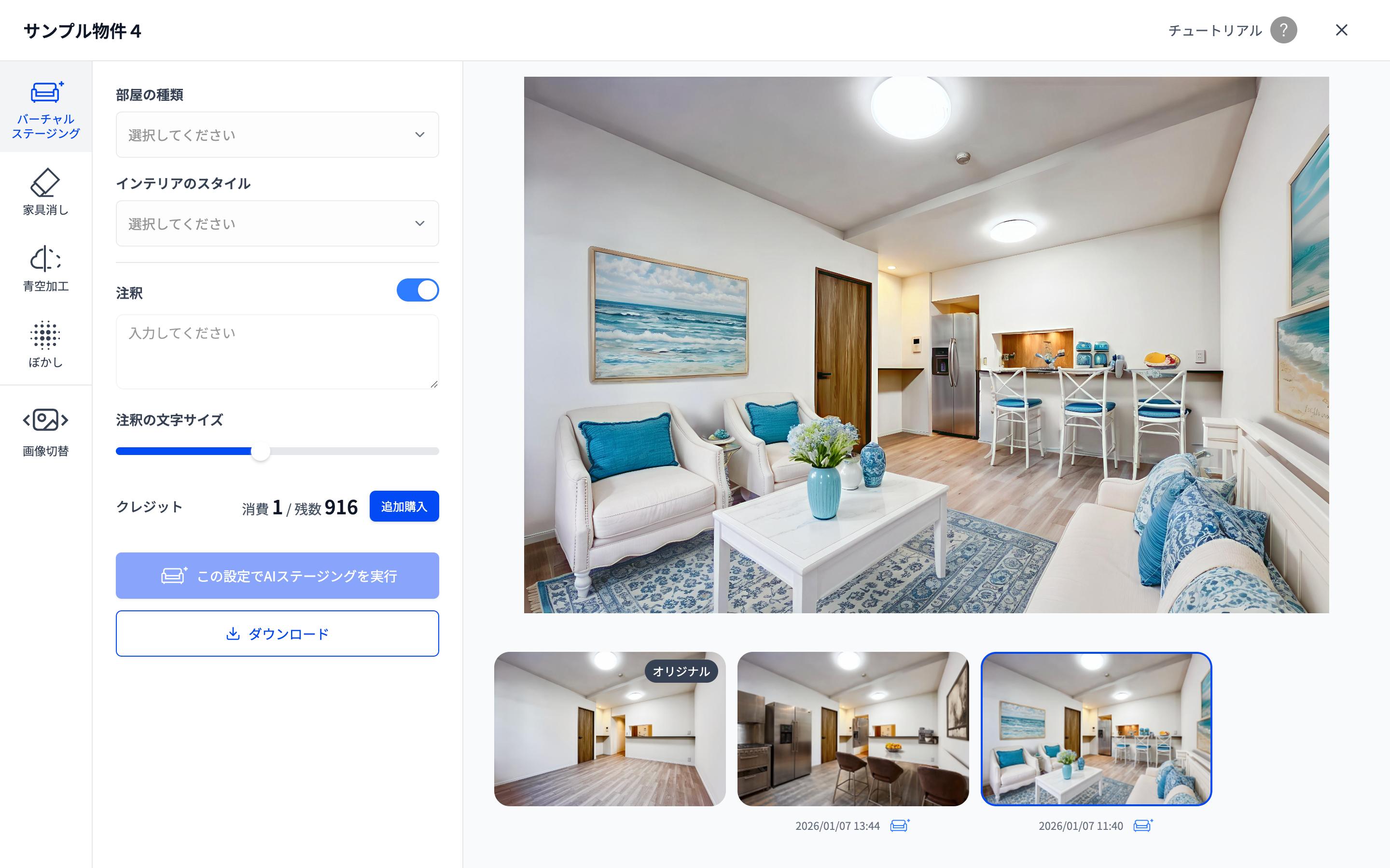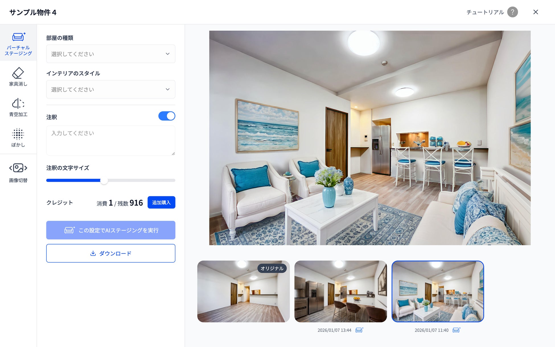 AIバーチャルステージング再生成機能:1クレジットで、配置する家具の種類を変更して同部屋のバーチャルステージング画像を複数枚を再生成可能になります。