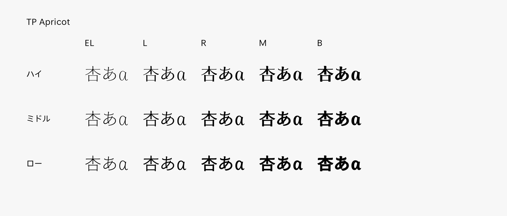 TP アプリコット ハイコントラストおよびミドルコントラストは、すでに提供中のローコントラストと同様、EL(エクストラライト)、L(ライト)、R(レギュラー)、M(ミディアム)、B(ボールド)の5 ウエイトで提供します。