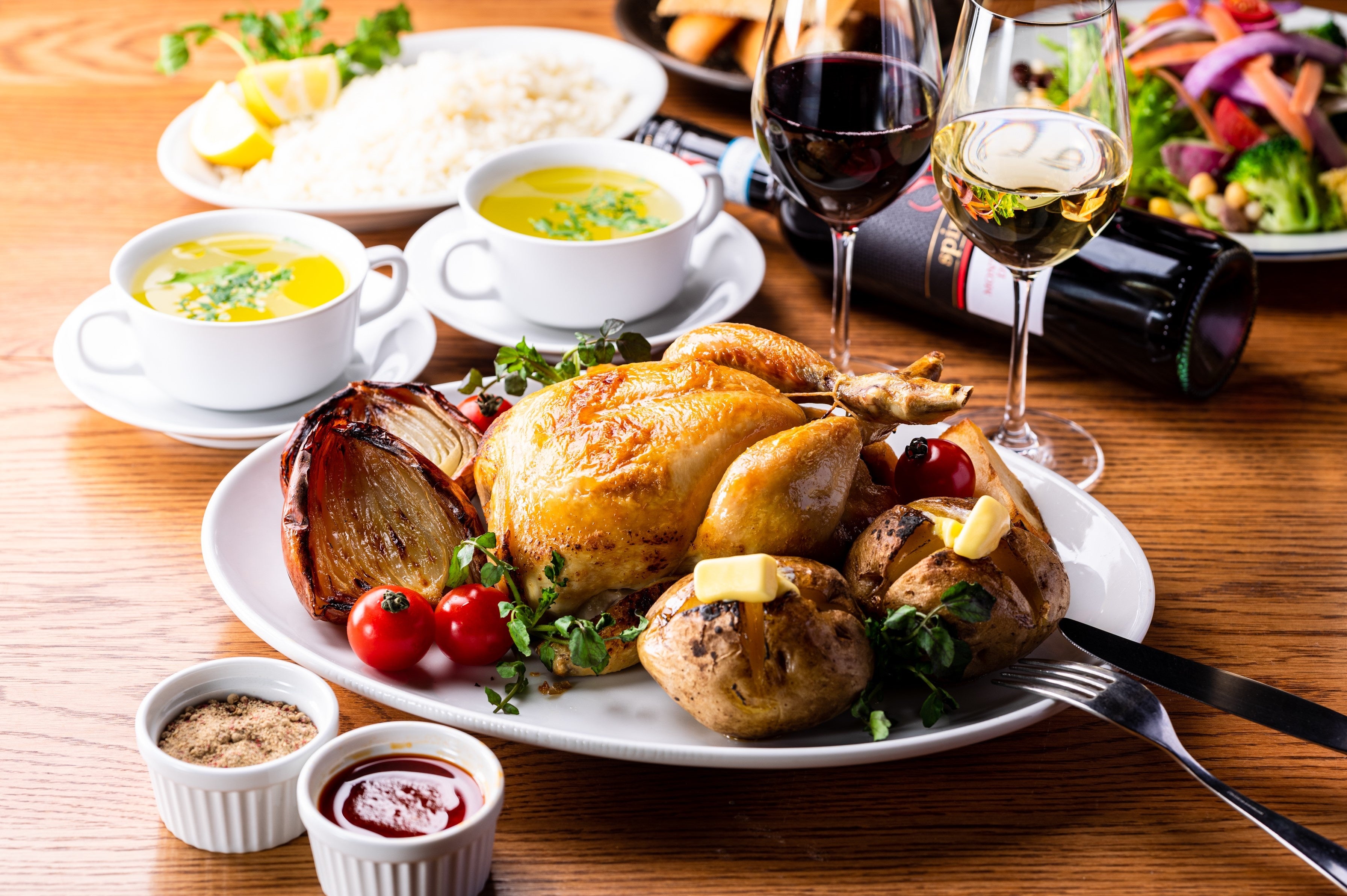 名物のロティサリーチキン、ピッツァやパスタ、各国のワインなどをお楽しみいただけるカジュアルレストランです。
