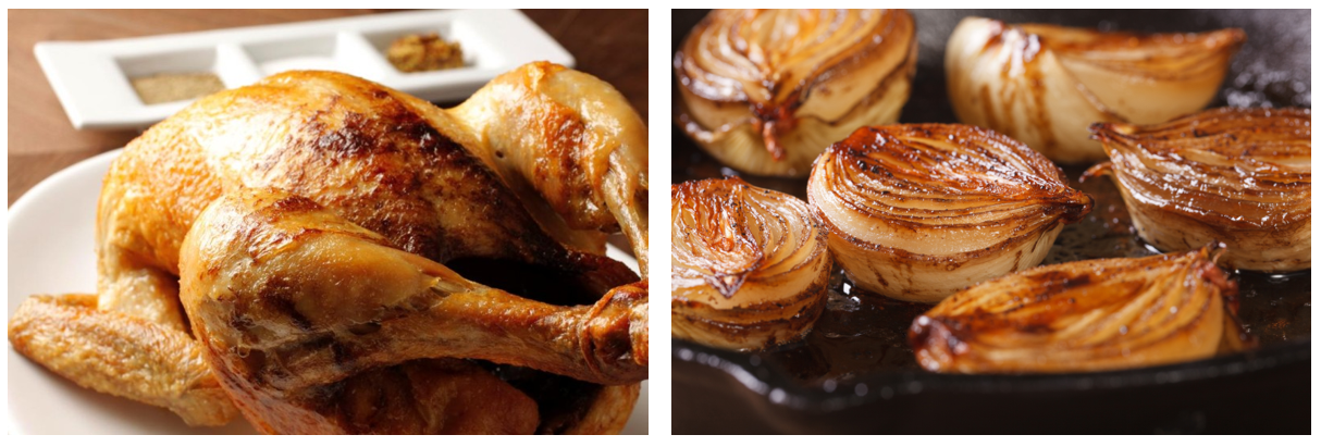 お皿の真ん中にチキン、周りにオニオンとポテトを置いて、230℃に余熱したオーブンで30分程焼き上げます。