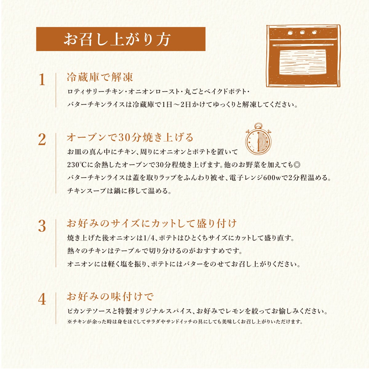 ロティサリーチキン・オニオンロースト・ベイクドポテト・バターチキンライス・チキンスープは冷蔵庫で約1日かけてゆっくりと解凍してください。