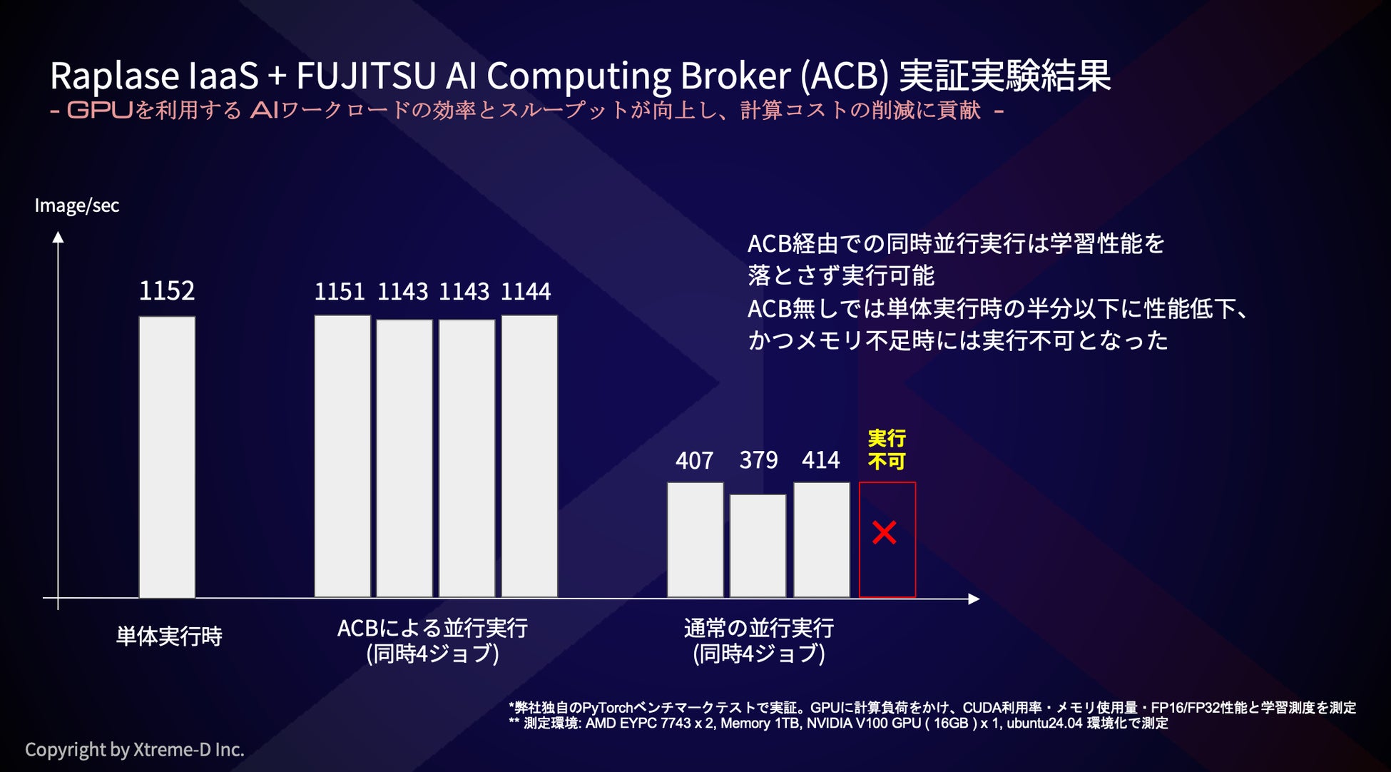 エクストリームーD株式会社(本社:東京都品川区、代表取締役:柴田 直樹、以下 エクストリームーD)は、富士通株式会社(本店:神奈川県川崎市、以下 富士通)と共同で進めてきた、AIリソース最適化技術「AI Computing Broker(以下、ACB技術)」の実装および検証作業を完了いたしました。