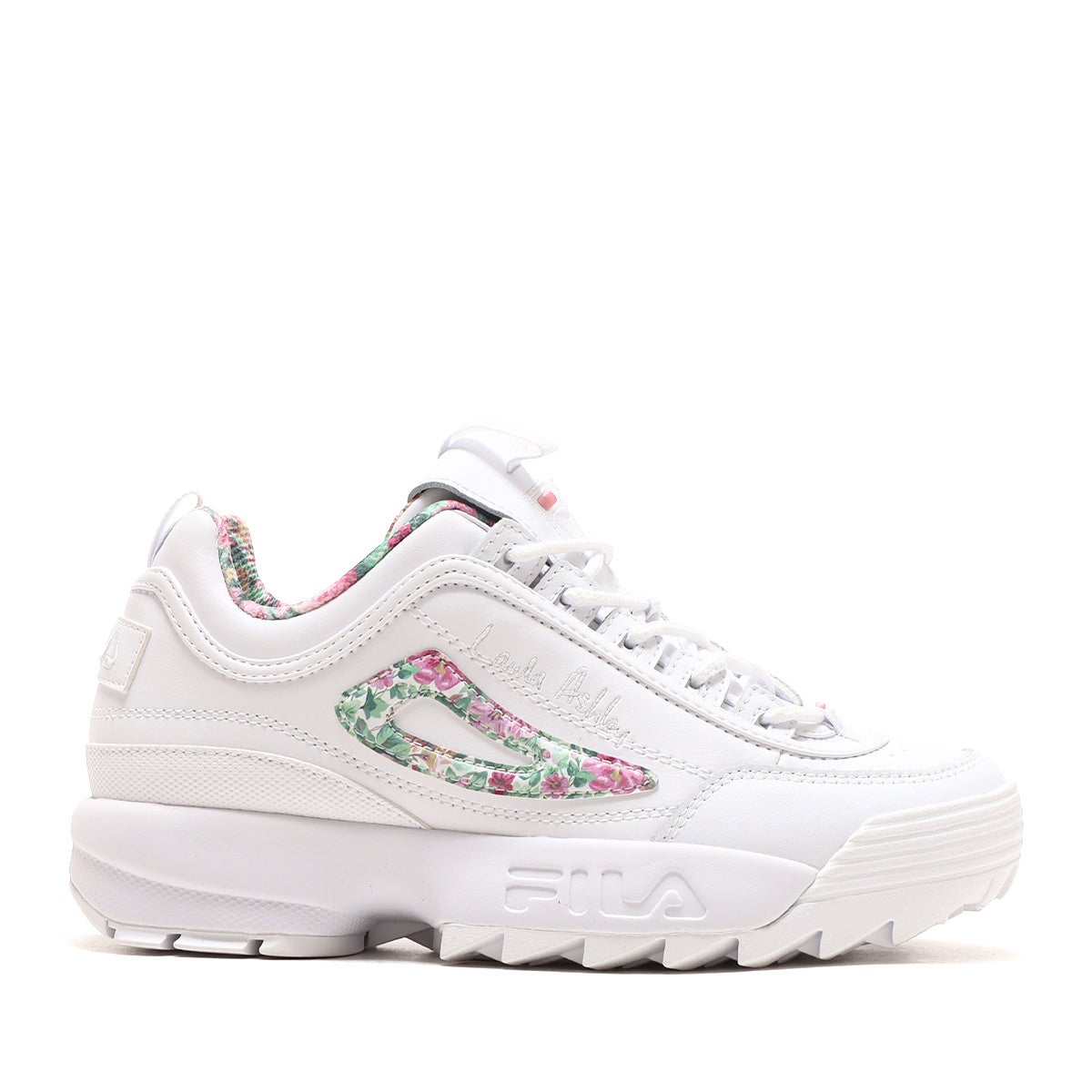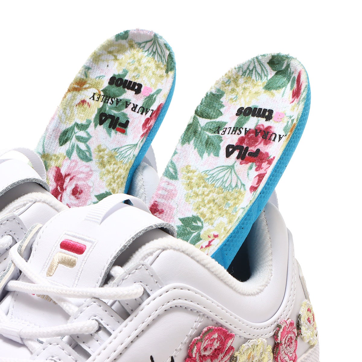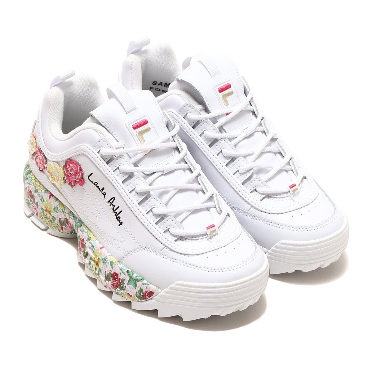 2023年春夏を華やかに飾る”FILA×Laura Ashley×atmos pink”のトリプルコラボレーション。異色ともとらえられるこのコラボレーションにより、ちょっぴり大人の世界に一歩足を踏み入れながら快適な履き心地を追求したシューズが3種類完成しました。ベースモデルは厚底かつ軽量なプラットフォームデザインで確かなクッショニングを確保したFILAスニーカーの代名詞ともいえる定番モデルの” Disruptor 2”から2種類、イタリアにあるFILAミュージアムから発掘されたモデルを復刻させ定番ビンテージレトロなアッパーをフィーチャーした人気のスタイリッシュな
