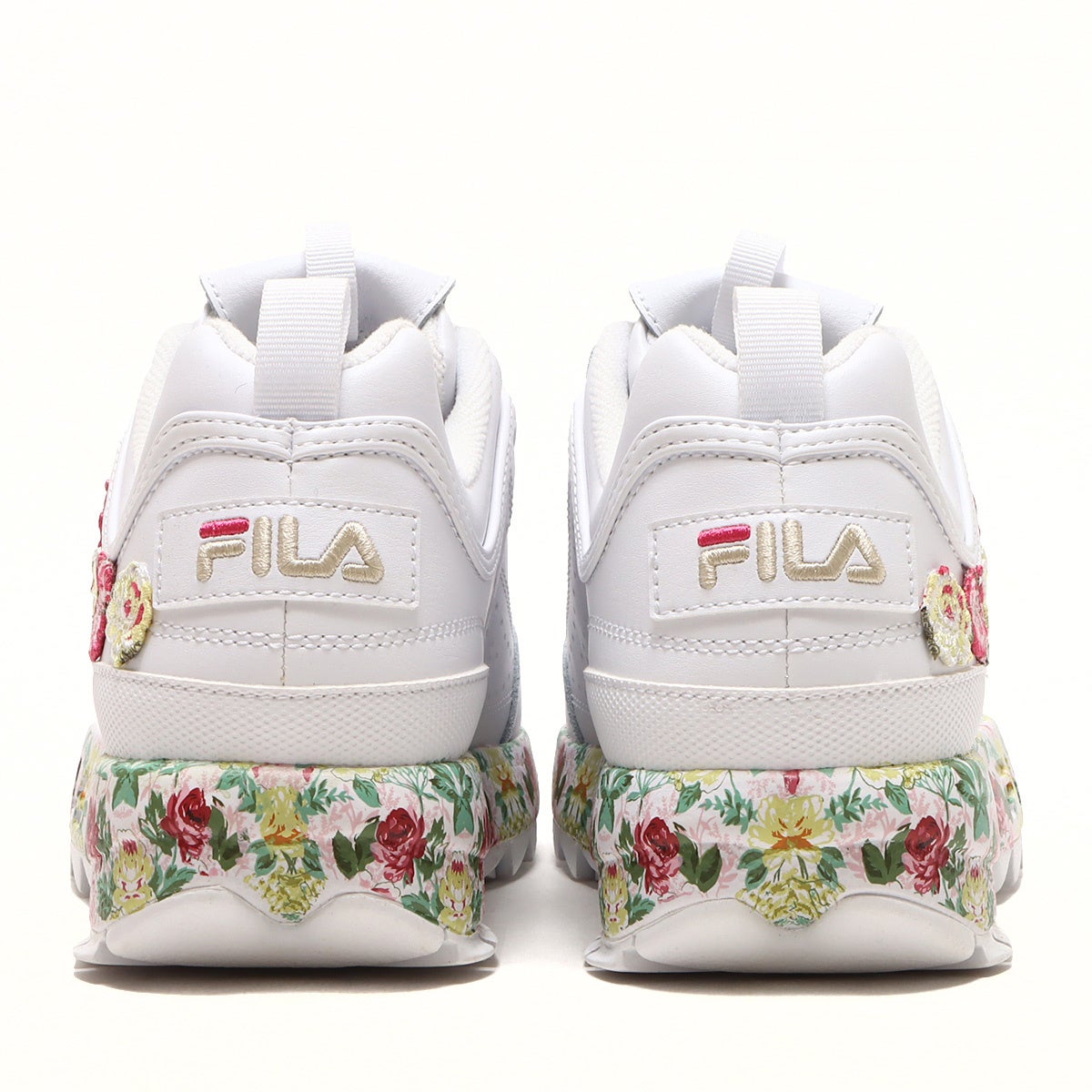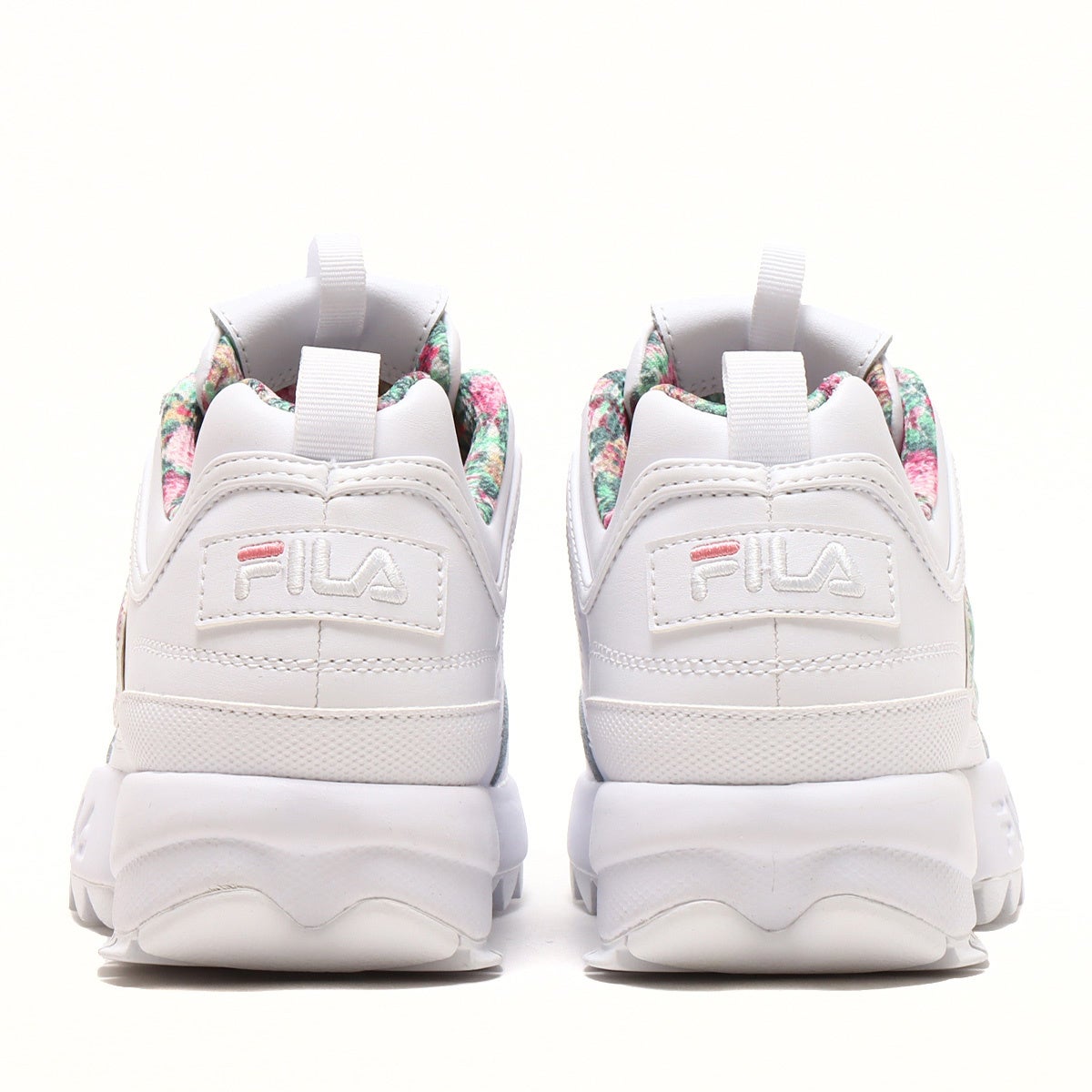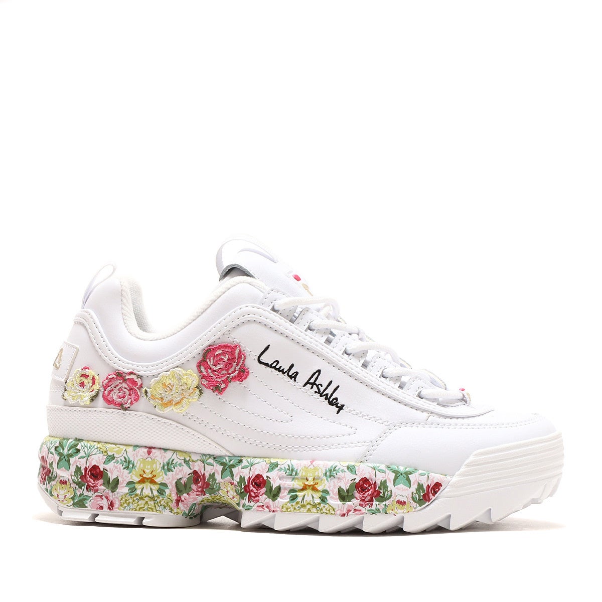 2023年春夏を華やかに飾る”FILA×Laura Ashley×atmos pink”のトリプルコラボレーション。異色ともとらえられるこのコラボレーションにより、ちょっぴり大人の世界に一歩足を踏み入れながら快適な履き心地を追求したシューズが3種類完成しました。ベースモデルは厚底かつ軽量なプラットフォームデザインで確かなクッショニングを確保したFILAスニーカーの代名詞ともいえる定番モデルの” Disruptor 2”から2種類、イタリアにあるFILAミュージアムから発掘されたモデルを復刻させ定番ビンテージレトロなアッパーをフィーチャーした人気のスタイリッシュな