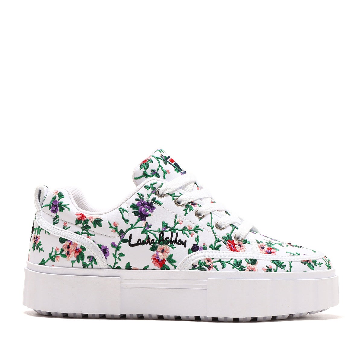 Laura Ashleyのオリジナル花柄刺繍ワッペンと、ミッドソールのプリントがスポーティーなボディに女の子らしいアクセントをプラス! 履くだけで華やかな気分になるデザインです。
