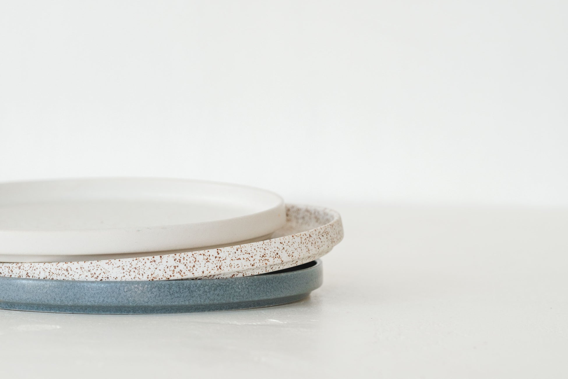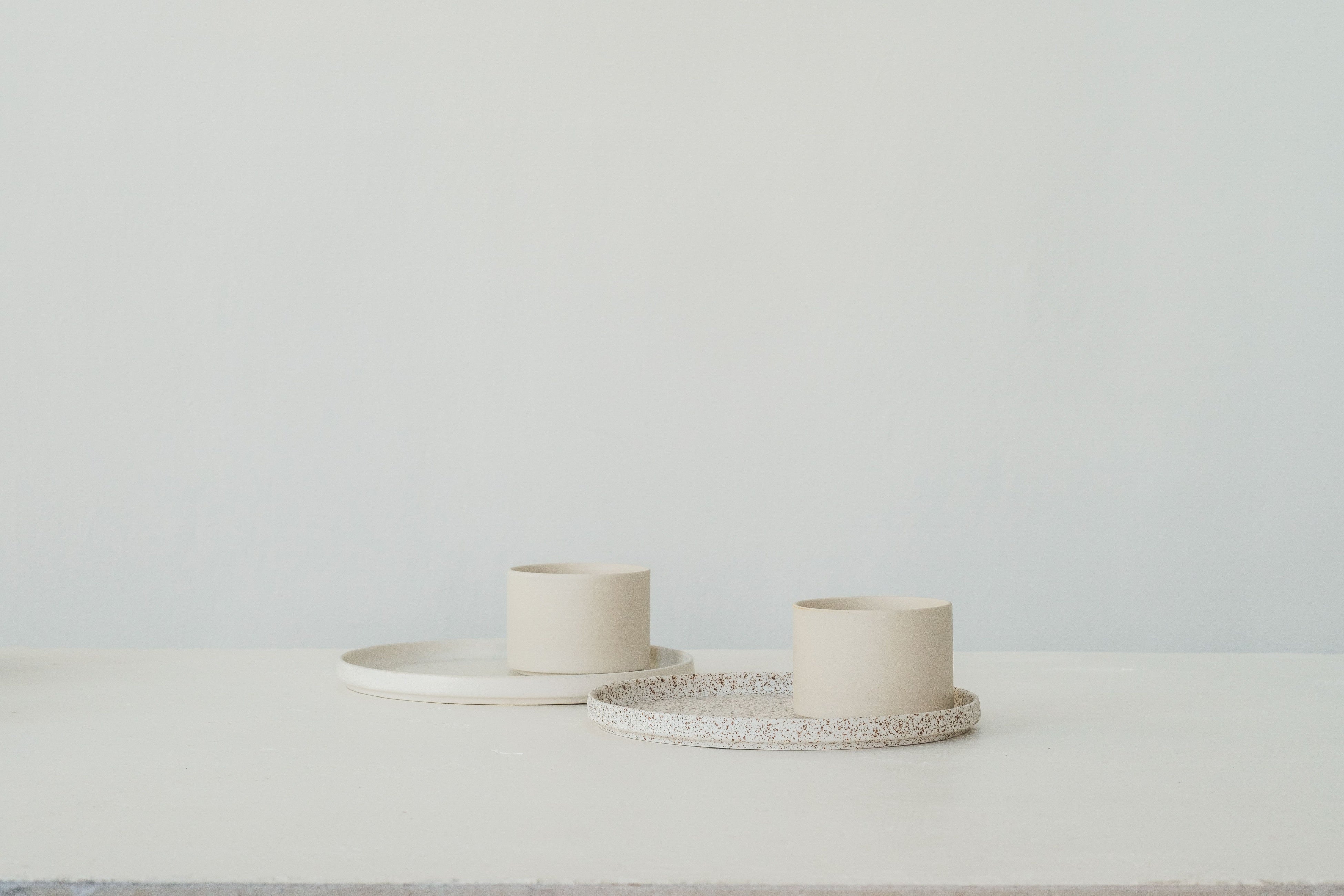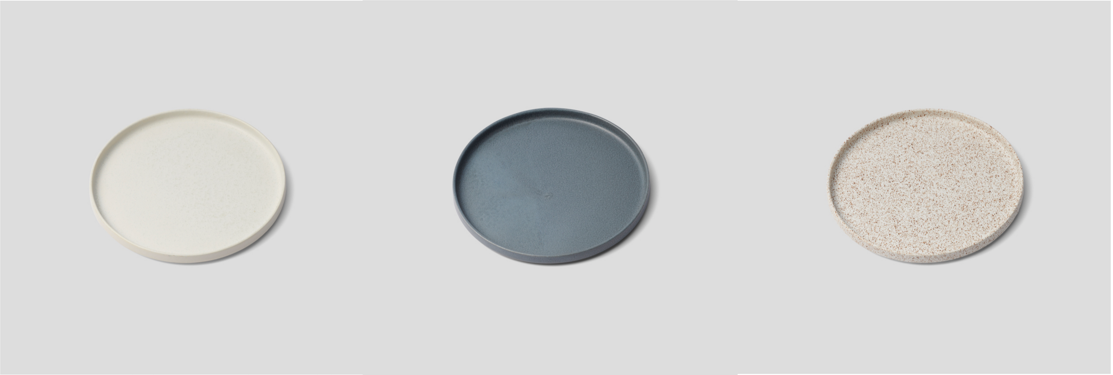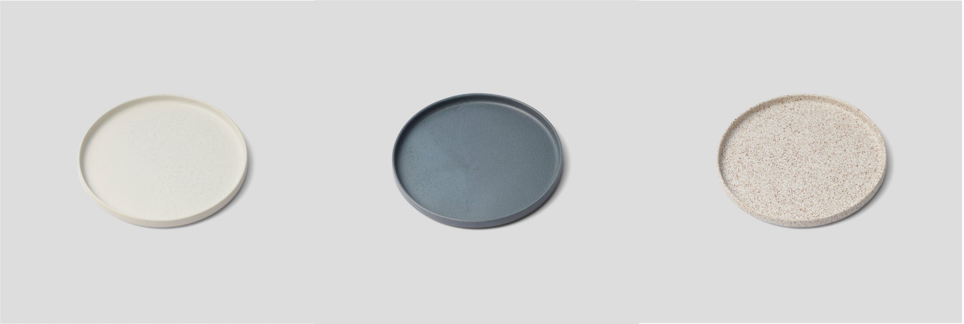 今回、新たに発売となる「切立プレート」は、直径約21cmのフラットなうつわで、白 / 灰 /錆点の3色のカラー展開。さらに2月にリニューアル発売した「カップ」と同様に、家庭で廃棄されたうつわを粉砕して土に混ぜたリサイクル土(※)を使用しています。