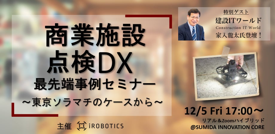 本イベントでは、マイクロドローンや3Dによるシミュレーション技術を駆使した最先端の点検手法を紹介します。また、東京ソラマチをはじめとする実例を交えながら、これからの商業施設の維持管理のあり方を共に考え、未来への道筋を探ります。