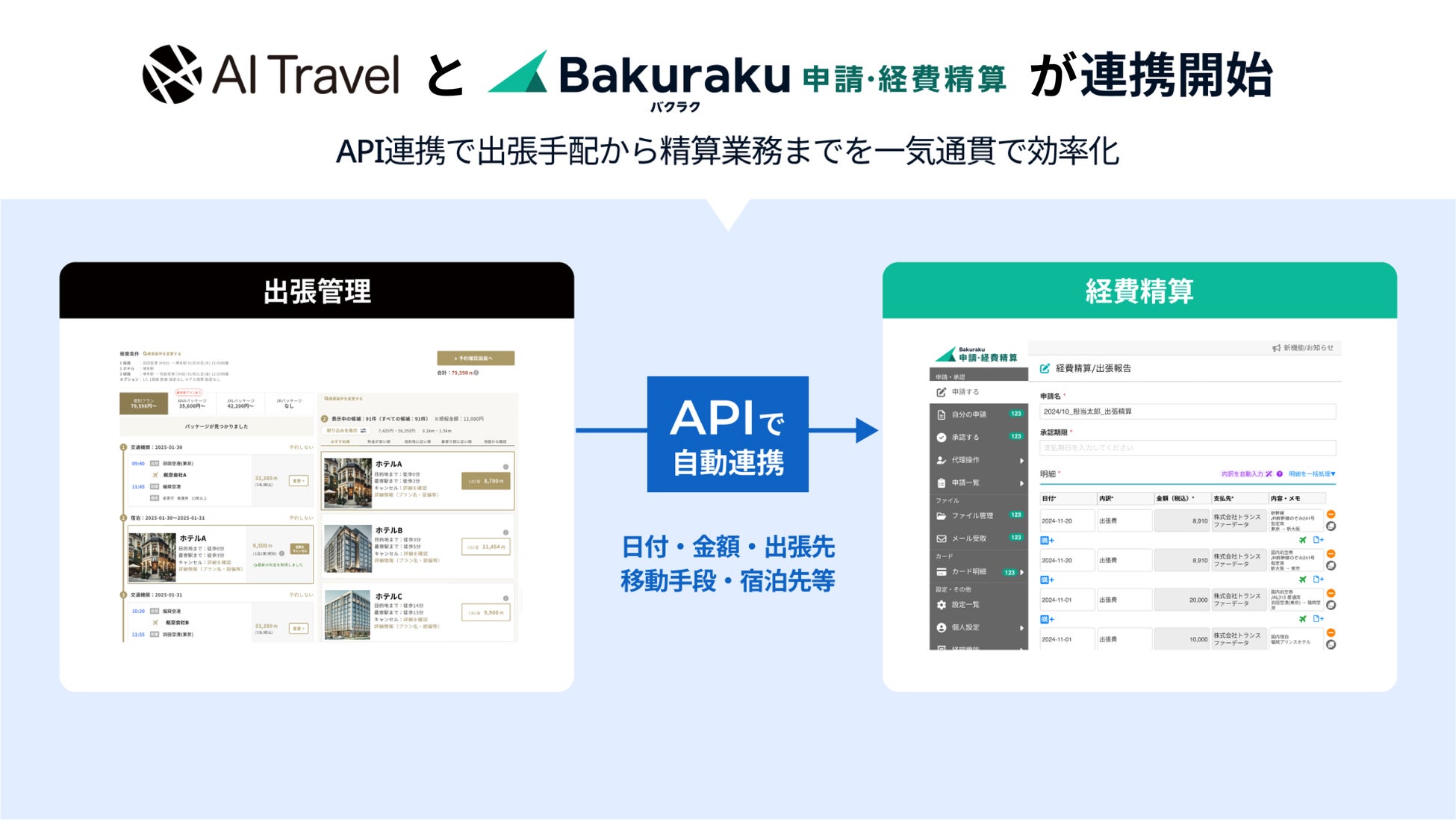 この度、「AI Travel」と「バクラク経費精算」の連携により、出張者がバクラク経費精算で精算を行う際に、「AI Travel」で手配した宿泊施設や交通機関などの出張手配データがAPI連携を通じて「バクラク経費精算」上の明細にボタン一つで自動入力されるようになりました。