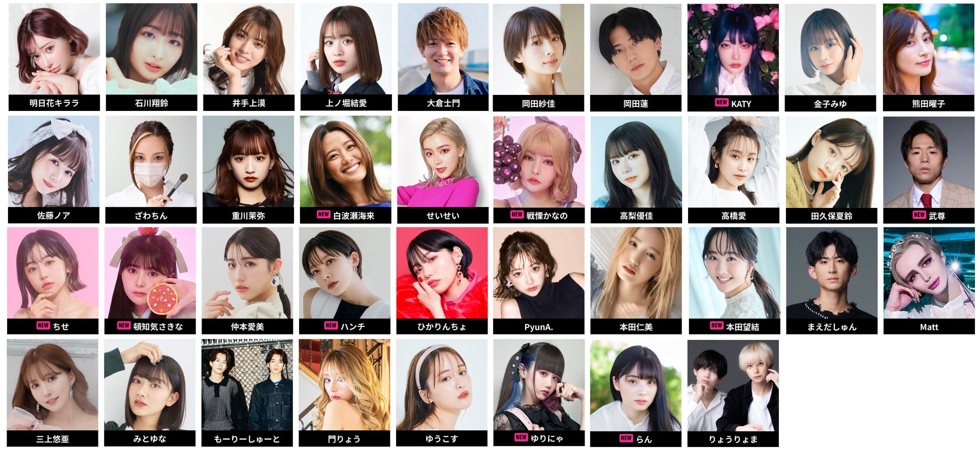 明日花キララ、石川翔鈴、井手上漠、上ノ堀結愛、大倉士門、岡田紗佳、岡田蓮、KATY、金子みゆ、熊田曜子、佐藤ノア、ざわちん、重川茉弥、白波瀬海来、せいせい、戦慄かなの、高梨優佳、高橋愛、田久保夏鈴、武尊、ちせ、頓知気さきな、仲本愛美、ハンチ、ひかりんちょ、PyunA.、本田仁美、本田望結、まえだしゅん、Matt、三上悠亜、みとゆな、もーりーしゅーと、門りょう、ゆうこす、ゆりにゃ、らん、りょうりょま