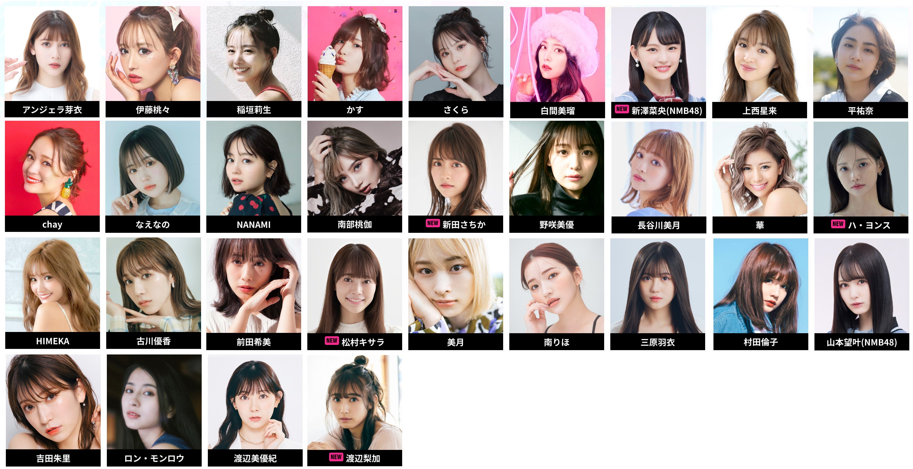 アンジェラ芽衣、伊藤桃々、稲垣莉生、かす、さくら、白間美瑠、新澤菜央(NMB48)、上西星来、平祐奈、chay、なえなの、NANAMI、南部桃伽、新田さちか、野咲美優、長谷川美月、華、ハ・ヨンス、HIMEKA、古川優香、前田希美、松村キサラ、美月、南りほ、三原羽衣、村田倫子、山本望叶(NMB48)、吉田朱里、ロン・モンロウ、渡辺美優紀、渡辺梨加