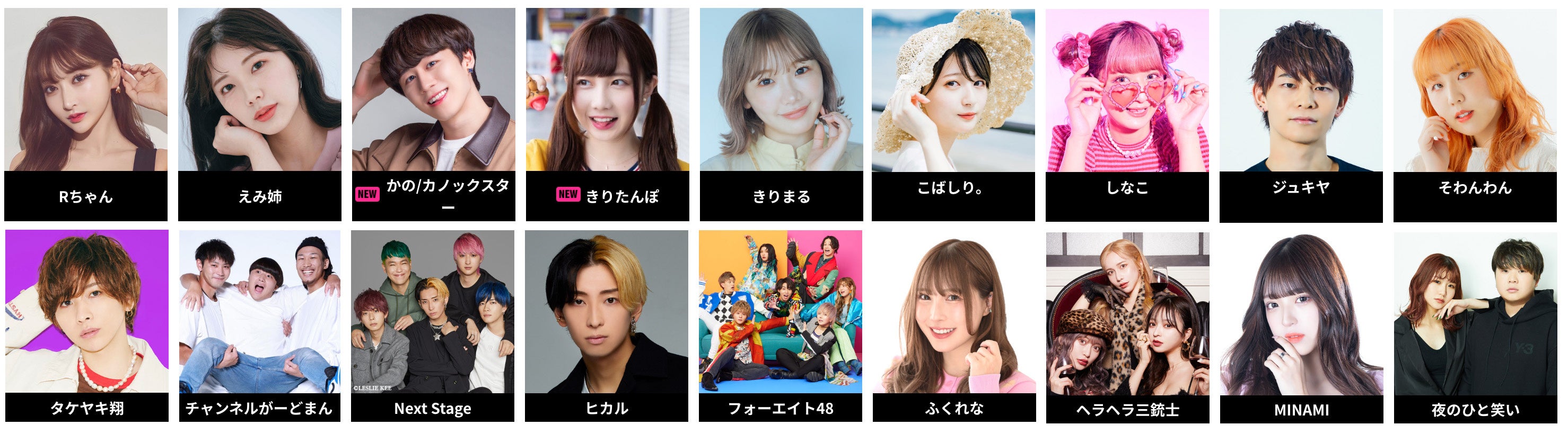 Rちゃん、えみ姉、かの/カノックスター、きりたんぽ、きりまる、こばしり。、しなこ、ジュキヤ、そわんわん、タケヤキ翔、チャンネルがーどまん、Next Stage、ヒカル、フォーエイト48、ふくれな、ヘラヘラ三銃士、MINAMI、夜のひと笑い