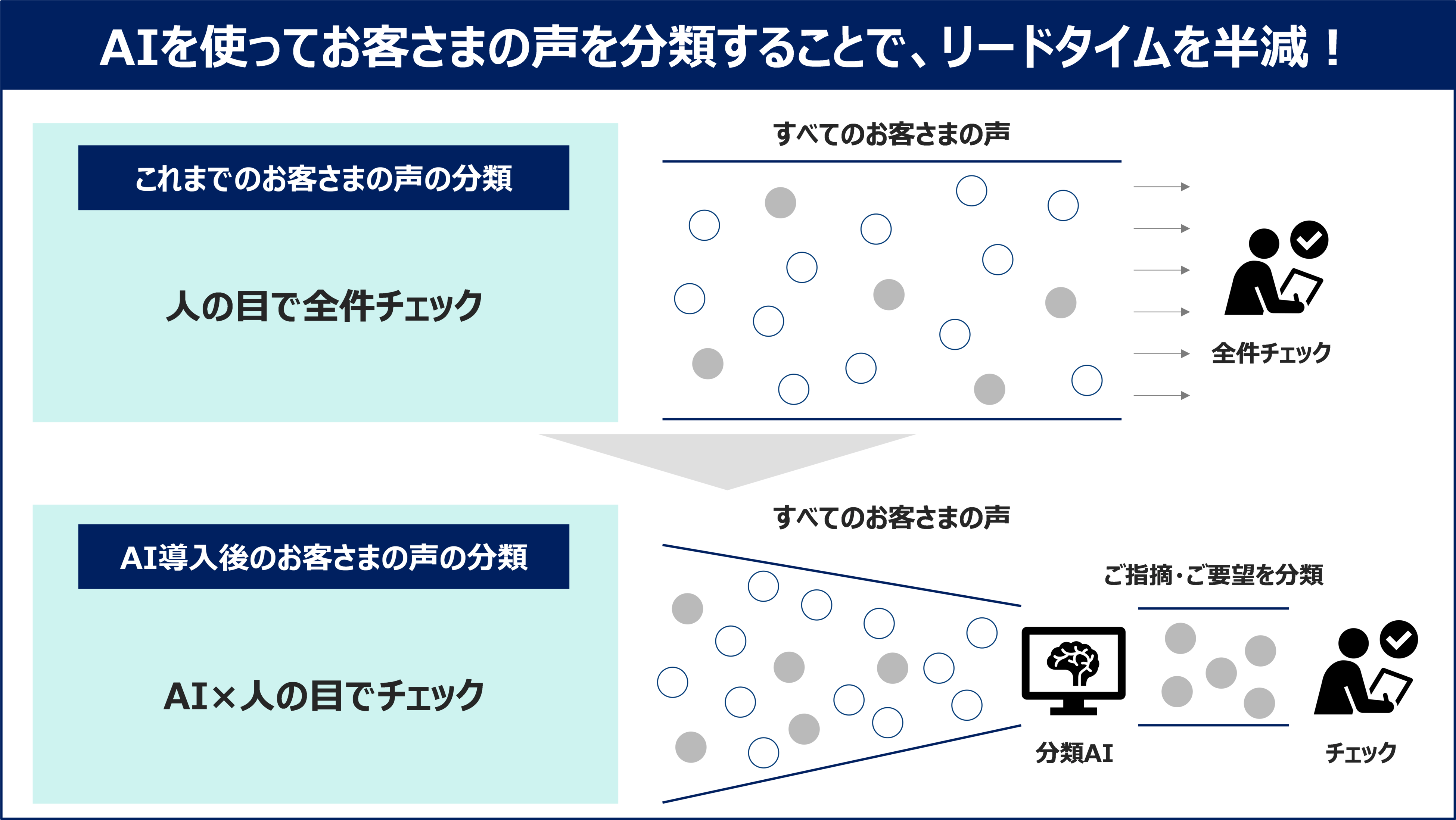今般この課題解決のために専用のAIを開発し、分類に要する時間を約100時間/月から約50時間/月に削減しました。これにより、削減した時間をより深い分析や改善策の検討に充てることで、これまで以上にお客さまに還元する取り組みを進めていきます。