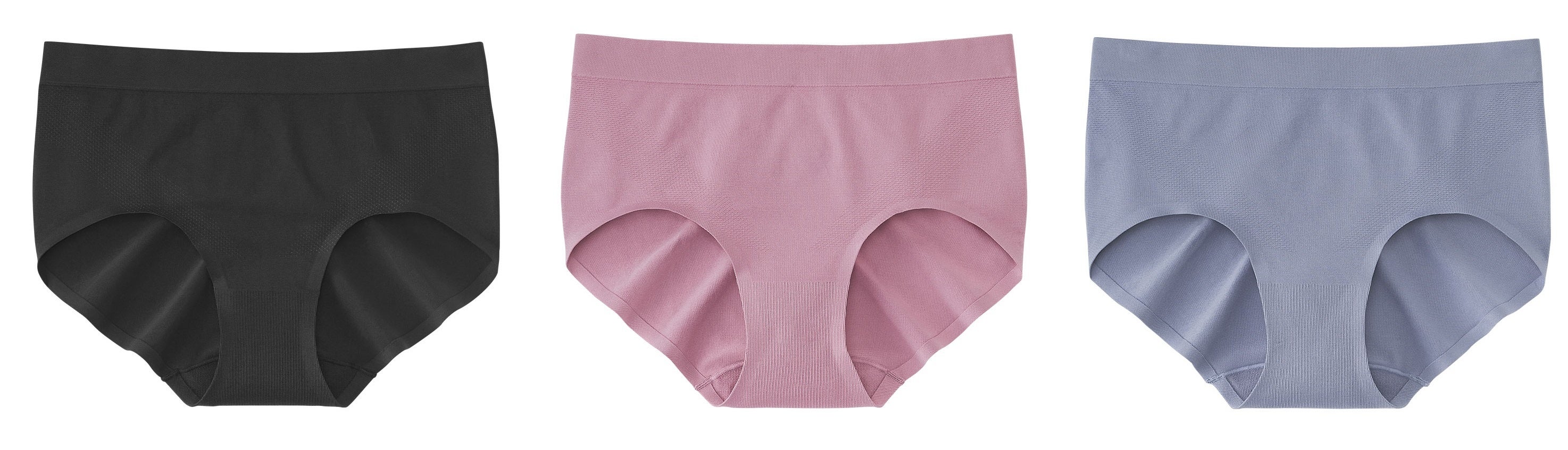 専用の編み機で編むことで、サイドの縫い目をなくした成型ショーツは足ぐり部分も接着テープ始末で縫い目を極力減らし、アウターに響きにくく、ストレスフリーな履き心地を実現しました。