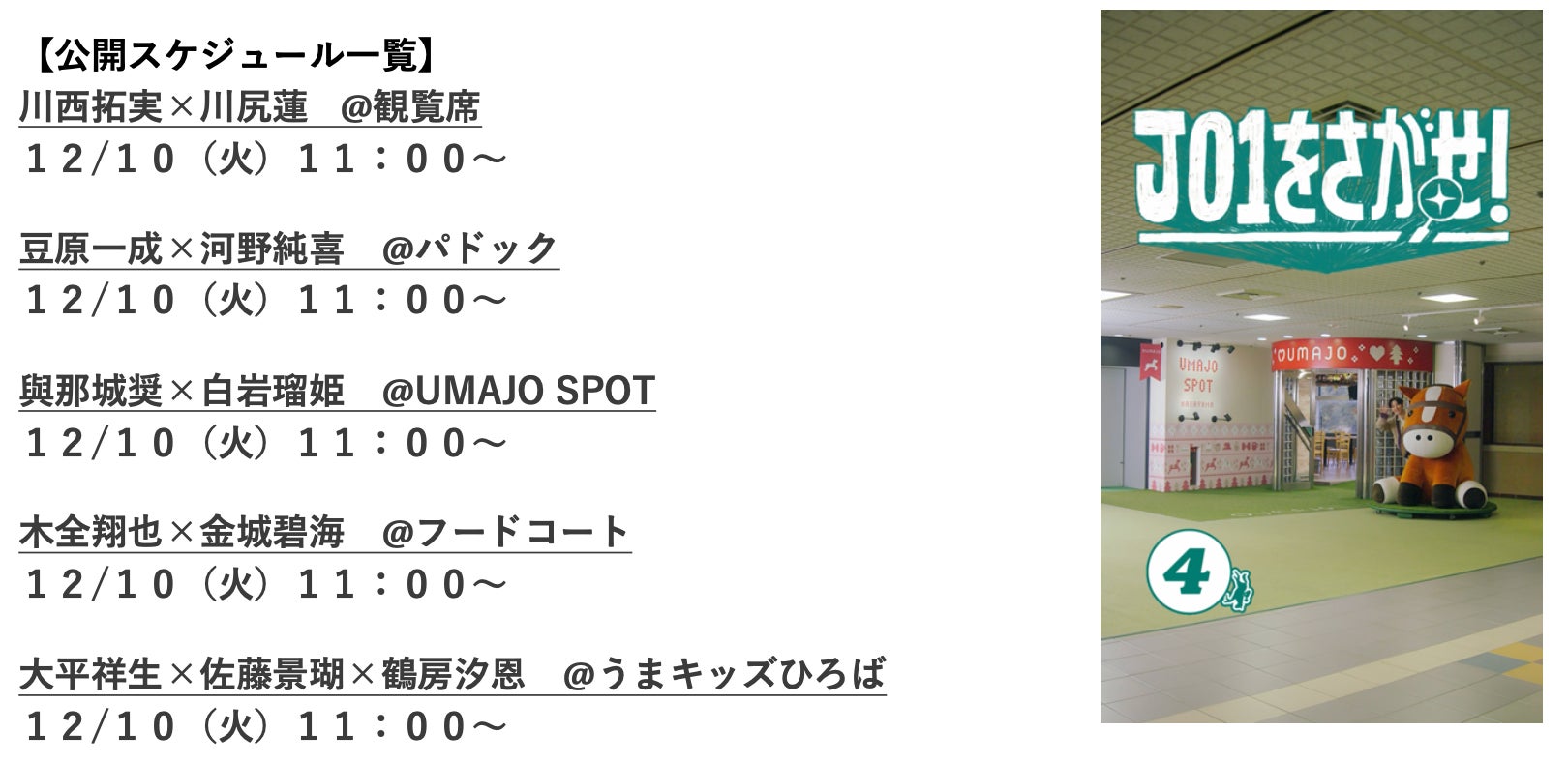競馬場に隠れたJO1を探し出せ!『JOin us AR1MA』では、中山競馬場の各スポットに隠れていたメンバーがその場所の特徴や楽しみ方のポイントを解説してくれるショートムービーも。12月10日(火)より公開いたします。