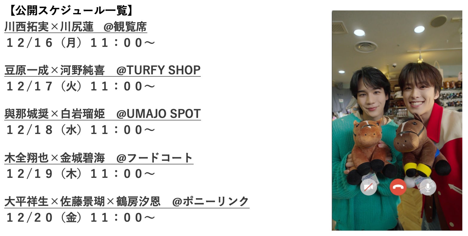 JO1のメンバーから、あなたのもとに有馬記念のお誘いコールが?!スペシャルムービーの撮影で休憩中のメンバーが、中山競馬場にある5つのおすすめスポットを紹介し、あなたを競馬場へと誘い出すショートムービーです。12月16日(月)より順次公開いたします。