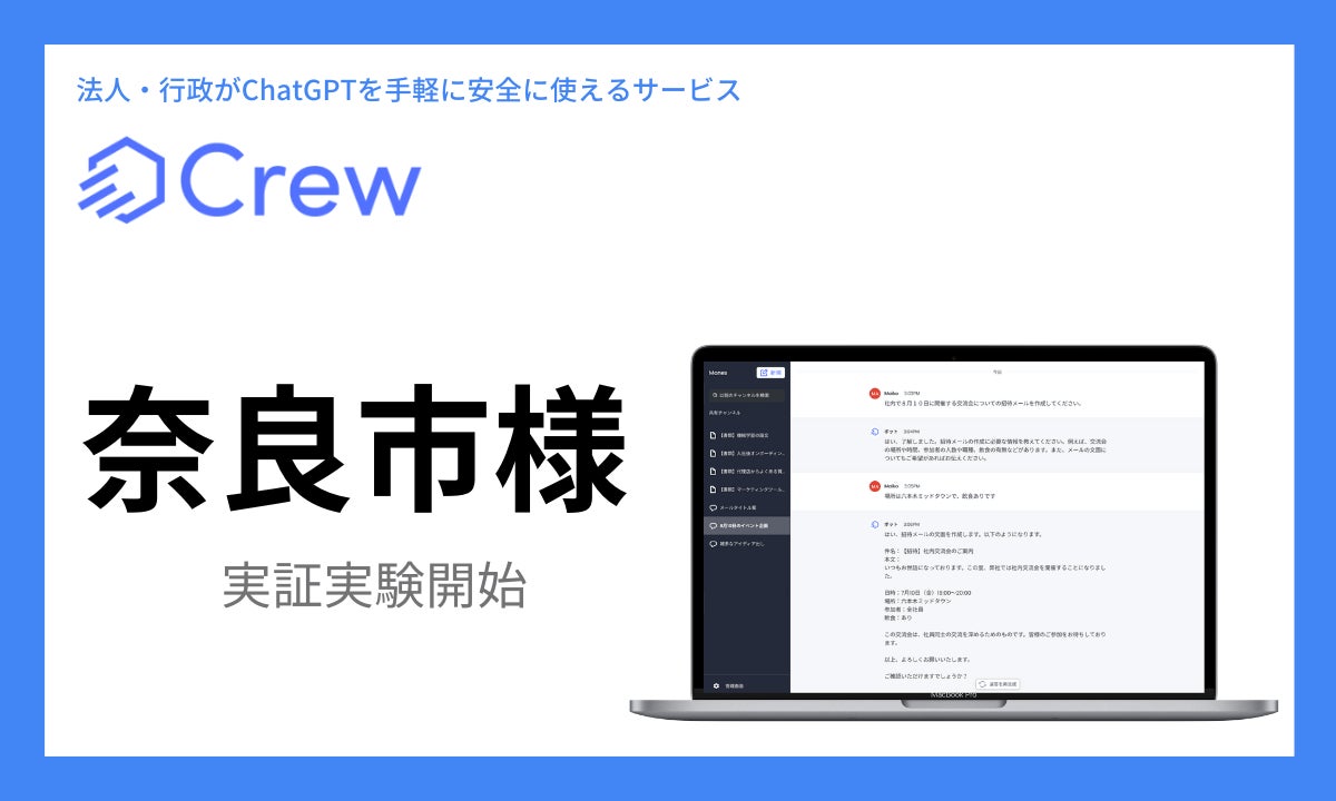 奈良市様がChatGPTをビジネス利用で安全に活用する業務効率化ツール「Crew」の実証実験開始