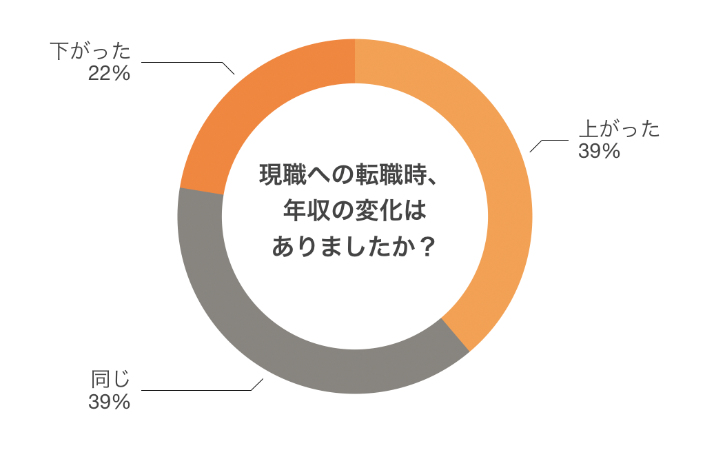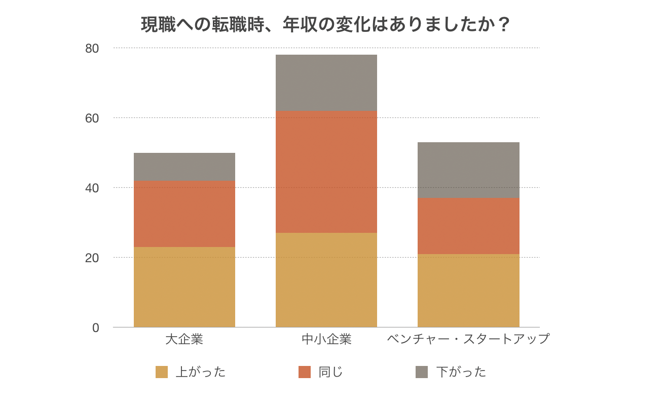 しかし本調査の結果、8割以上の人がボーナスを受け取っており、17%の人は一度に101万円~200万円を受け取ったことがあると分かりました。実際に年収に関して質問したところ、大手・中小企業からスタートアップ・ベンチャーへ転職した人の中で39%が「前職より年収が上がった」と回答。「前職より年収が下がった」と回答した人はわずか22%という結果となりました。