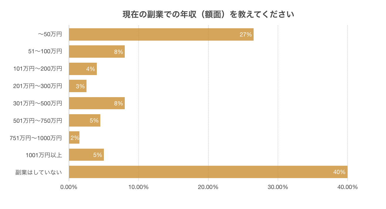 そのうち42.5%の人が副業で100万円以上稼いでおり、全国の平均年収である433万円を超える500万円以上を副業で稼ぐ人も18%存在した。