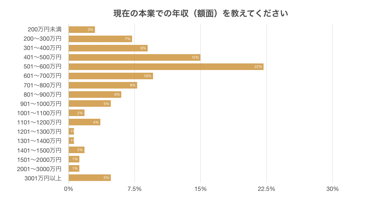 年収で最も多い割合は501万~600万円。10%が年収1000万円以上。民間給与実態統計調査(※1)によると、1000万円以上の給与をもらっている人は全国で1.8%、平均給与は433万円となり、大幅に給与水準が高かった。