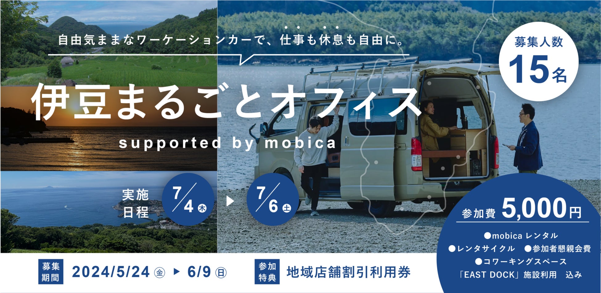 ・内容:伊豆半島どの地域へも1時間圏内で移動できる東伊豆を拠点に、mobicaを使って伊豆半島全域の美しいパノラマを巡る2泊3日のワーケーション体験。