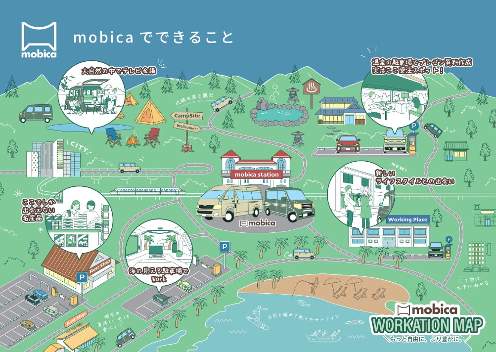 自宅から主要駅を経由し、観光地の研修施設やワーケーション用施設を往復するのも1つのワーケーションの形ですが、mobicaでは働く皆さんがより自由に「好きな場所を選んで働く」ことを実現できます。例えば波の音を聞きながら海の見える駐車場で仕事をしたり、大自然の中でWeb会議ツールを使ったディスカッション、温泉やサウナでリフレッシュした後にプレゼン資料を作成、作業の合間で地元の人から愛される美味しいお店を訪れたり…と楽しみ方は自由自在です。可動産というメリットを最大限に活かし、目的地までの道中や各地域での新たな出会い、発見を楽しめる世界観を目指しています。