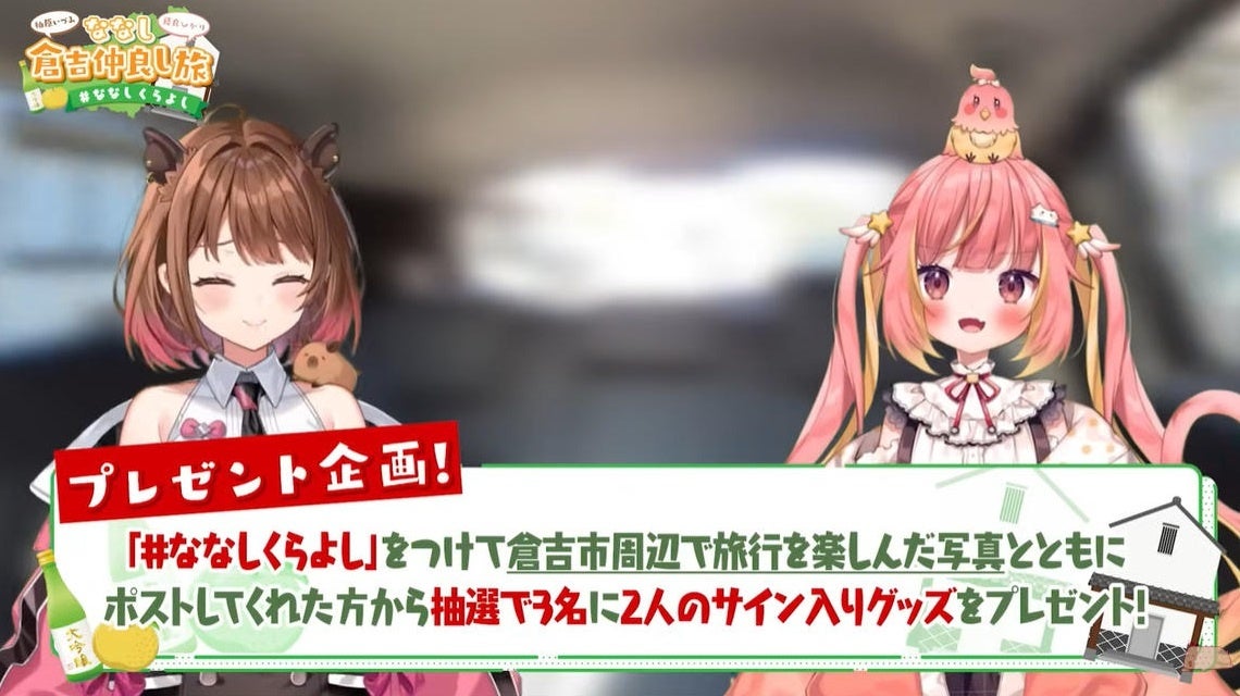 チャンネル登録者数合計200万人以上のVTuberグループ『ななしいんく(https://www.774.ai/)』の柚原いづみ、飛良ひかりによる、倉吉現地の旅行動画「ななし倉吉仲良し旅(https://www.youtube.com/watch?v=OBxXyS4e-0E)」を公開。現地の倉吉市を実際に旅行した動画となっており、倉吉市を訪れる際のおすすめ観光スポットや、地元グルメの魅力をお届けします。