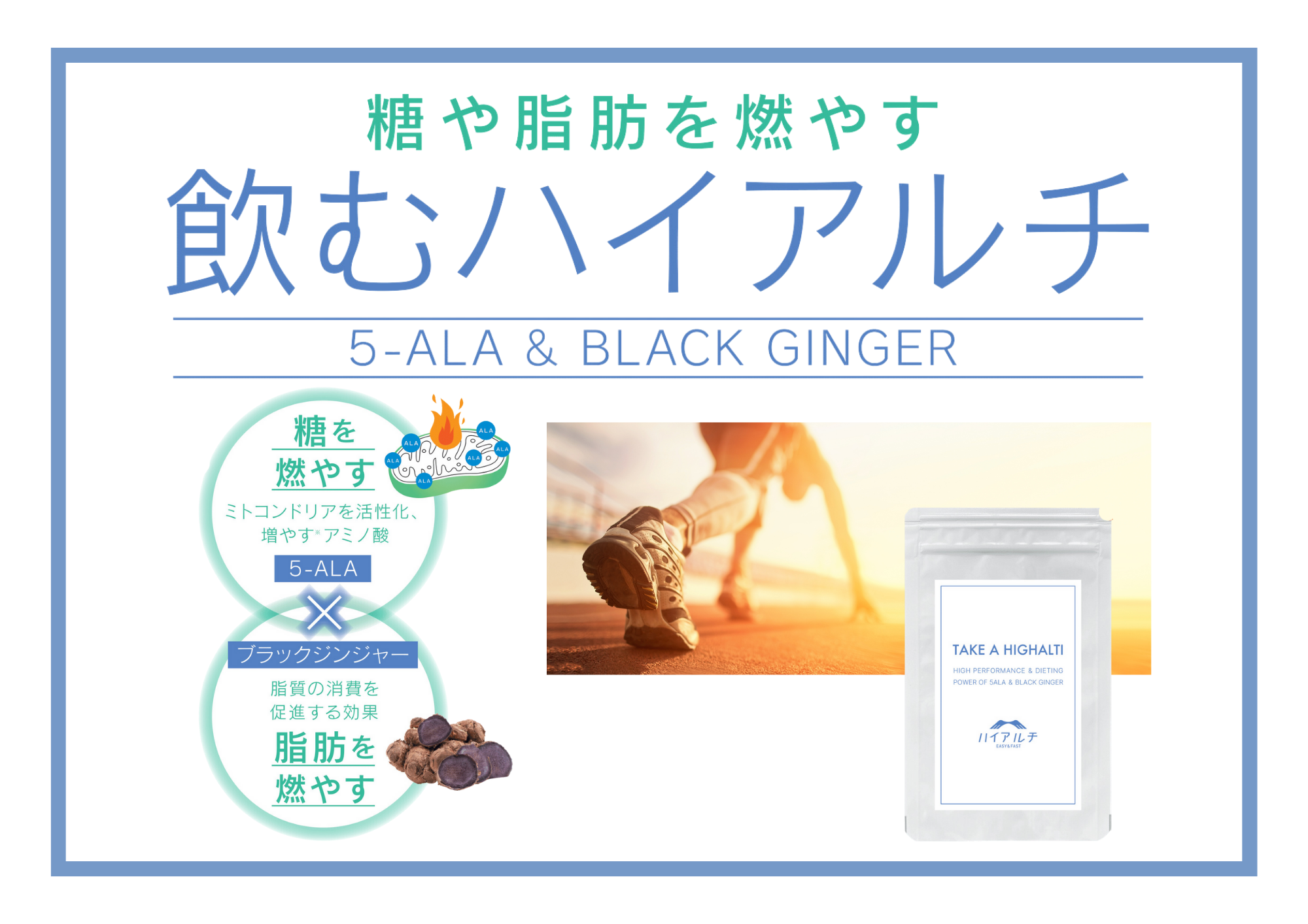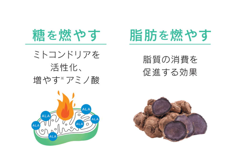 また、飲むハイアルチは5-ALA*に加えブラックジンジャーを組み合わせた配合により、5-ALA由来の糖代謝およびミトコンドリア活性に加えてブラックジンジャーによる脂肪燃焼へのアプローチも行います。これにより運動パフォーマンスの向上を求めるアスリートだけでなく運動ダイエットを目的としたお客様にも非常にご好評をいただいております。