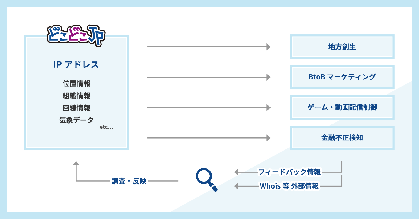 「どこどこJP」は、IPアドレスとそれに紐づいた地域・組織・気象・回線情報など100種類以上の情報を、インターネットを介して利用できるAPIサービスです。IPv4アドレスとIPv6アドレスの全てIPアドレスを搭載しており、インターネットユーザの100%を網羅しています。搭載している情報は、品質と精度向上のためにIPアドレスに関する情報の収集・調査・反映を日次で行い、情報の信頼性向上のため新しい技術の開発を行なっております。どこどこJPに搭載された情報を組み合わせることで、地方創生、BtoBマーケティング、動画・ゲーム配信制御・金融不正検知などの分野で活用されています。