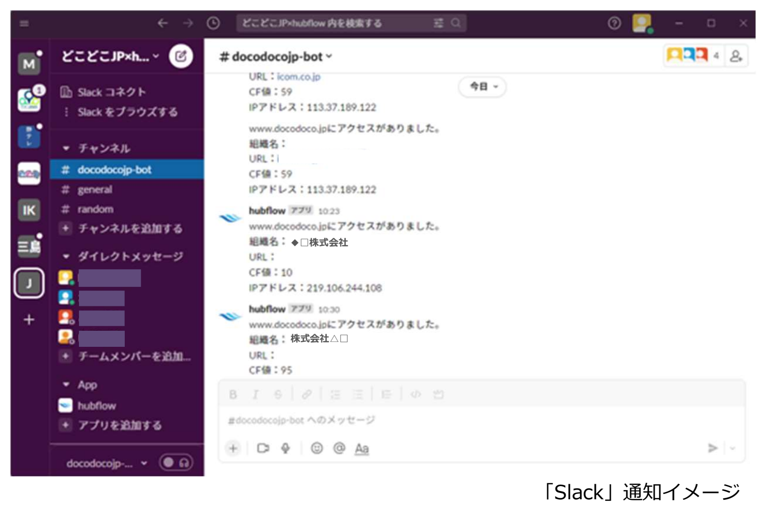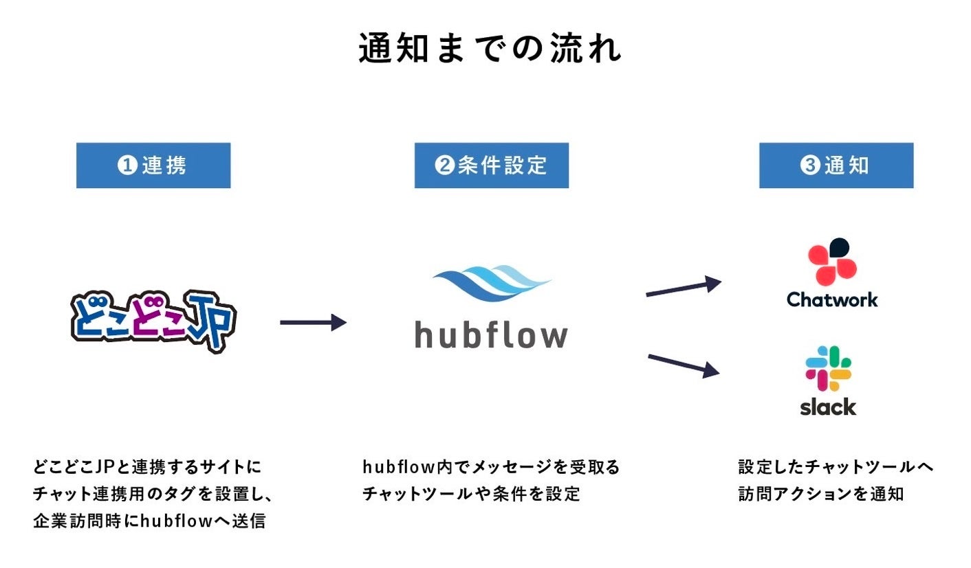「どこどこJP」と「hubflow」を連携することで、「どこどこJP」と連携しているWebサイトへ組織(法人や団体など)のアクセスがあった場合、その企業名をリアルタイムで「Chatwork」や「Slack」で通知することが可能になりました。これまで「どこどこJP」では、Webサイトへアクセスしてきた組織を確認するには管理画面より操作を行う必要がありましたが、この度の連携により、タイムリーかつ自動的に情報を取得することが可能になり、より効率的なBtoBマーケティングサポートを行います。