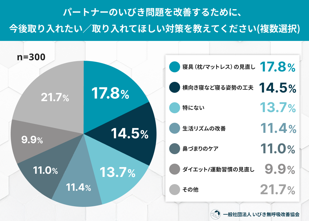 その他:21.7%(無呼吸の検査を受けてほしい:7.7%、睡眠環境を整える(加湿器など):6.6%、就寝前の飲酒を控えてほしい:6.2%、その他:1.2%)